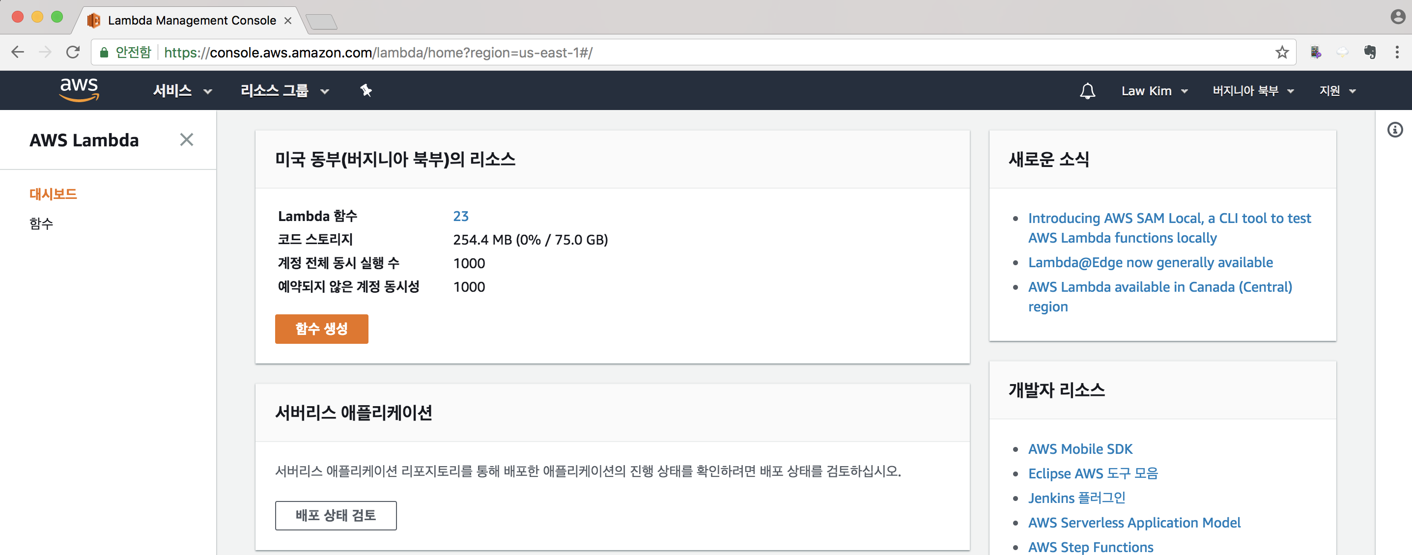 이제 AWS Lambda를 시작해 봅시다. AWS Lambda 콘솔 페이지(https://console.aws.amazon.com/lambda/home)로 이동합니다. 현재 접속한 리전(지역)을 다시 한 번 확인하세요. 앞서 SES를 설정한 리전과 동일한 리전에서 진행해야 합니다. 우리는 버지니아 북부에서 진행하고 있습니다.
