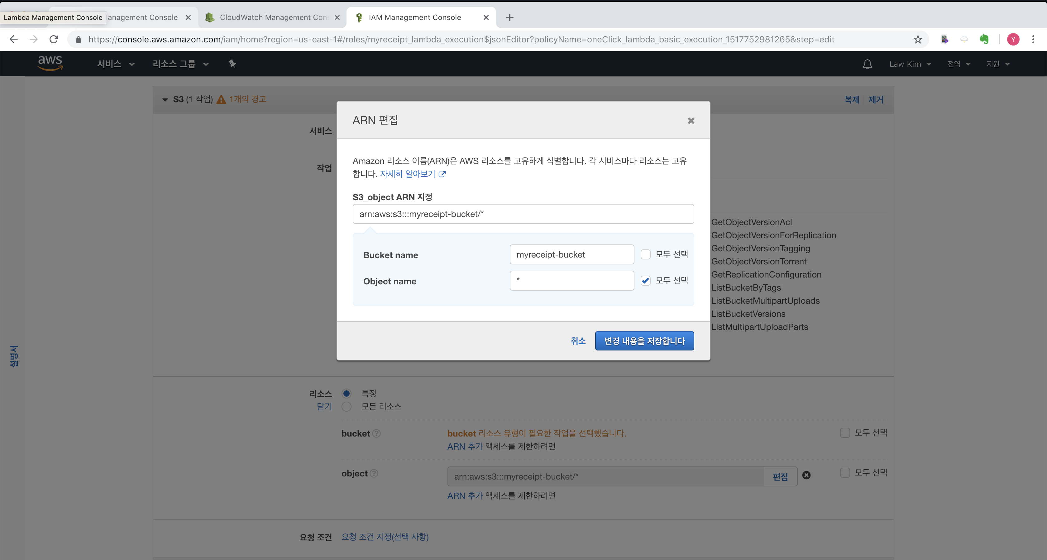 다음으로 ‘리소스’ 항목에서 ‘특정’을 선택합니다. 그리고, object 항목에서 “ARN 추가”를 선택합니다. Bucket name에는 ‘myreceipt-bucket’을 입력합니다. Object name에는 “모두 선택”을 체크하고 저장합니다.