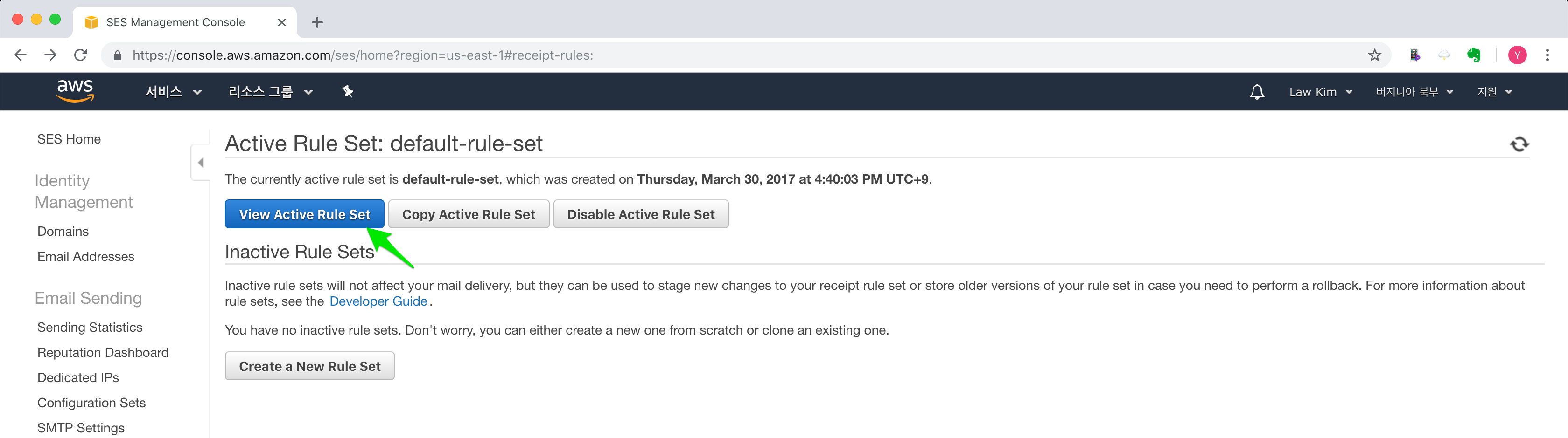 앞서 설정 했던 Rule Sets 페이지(https://console.aws.amazon.com/ses/home?region=us-east-1)로 이동합니다.