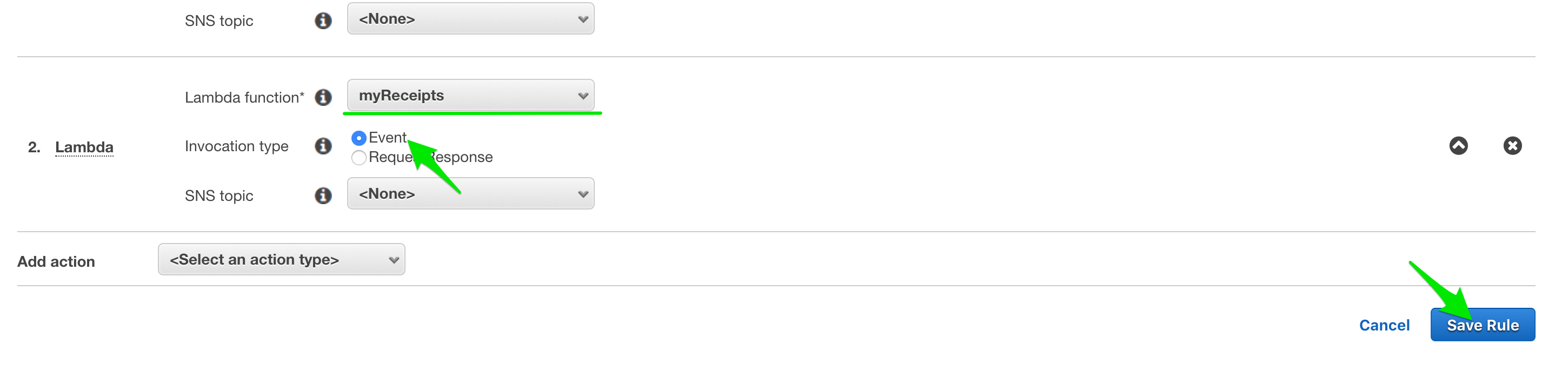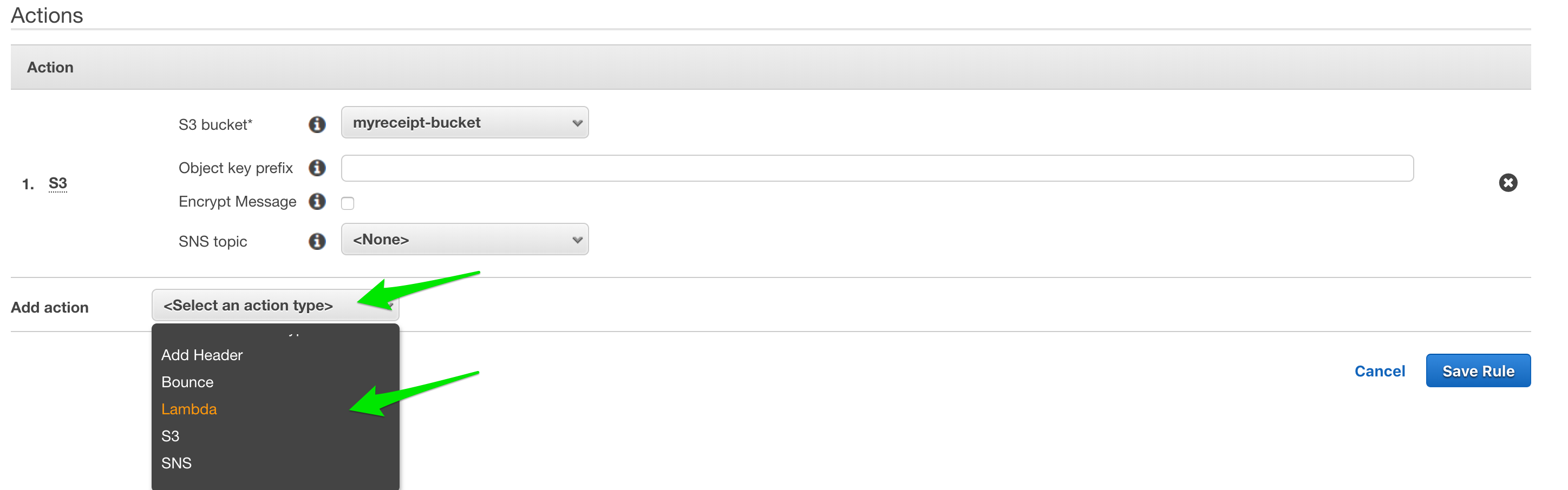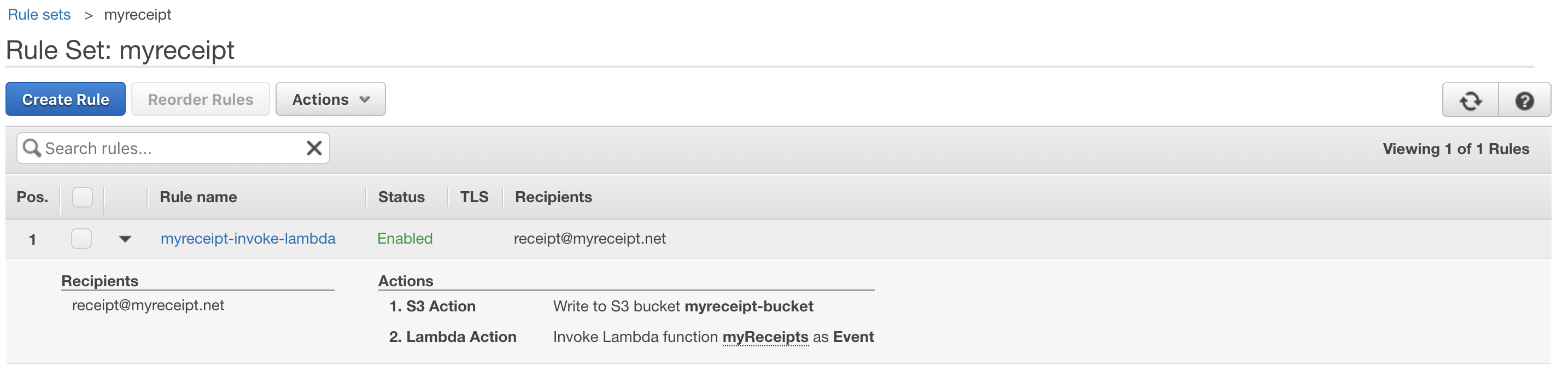 두 번째 동작(Action)으로 Lambda가 추가됐습니다. Lambda function 항목에는 내가 작성했던 Lambda 함수 이름(myReceipts)을 입력하도록합니다. 만약 내가 작성한 Lambda함수가 보이지 않는다면, SES가 생성된 리전(us-east-1)과 동일한 리전에서 Lambda함수가 생성되었는지 확인합니다. 서로 다른 리전에 있는 경우, SES에서 Lambda를 트리거 할 수 없습니다.