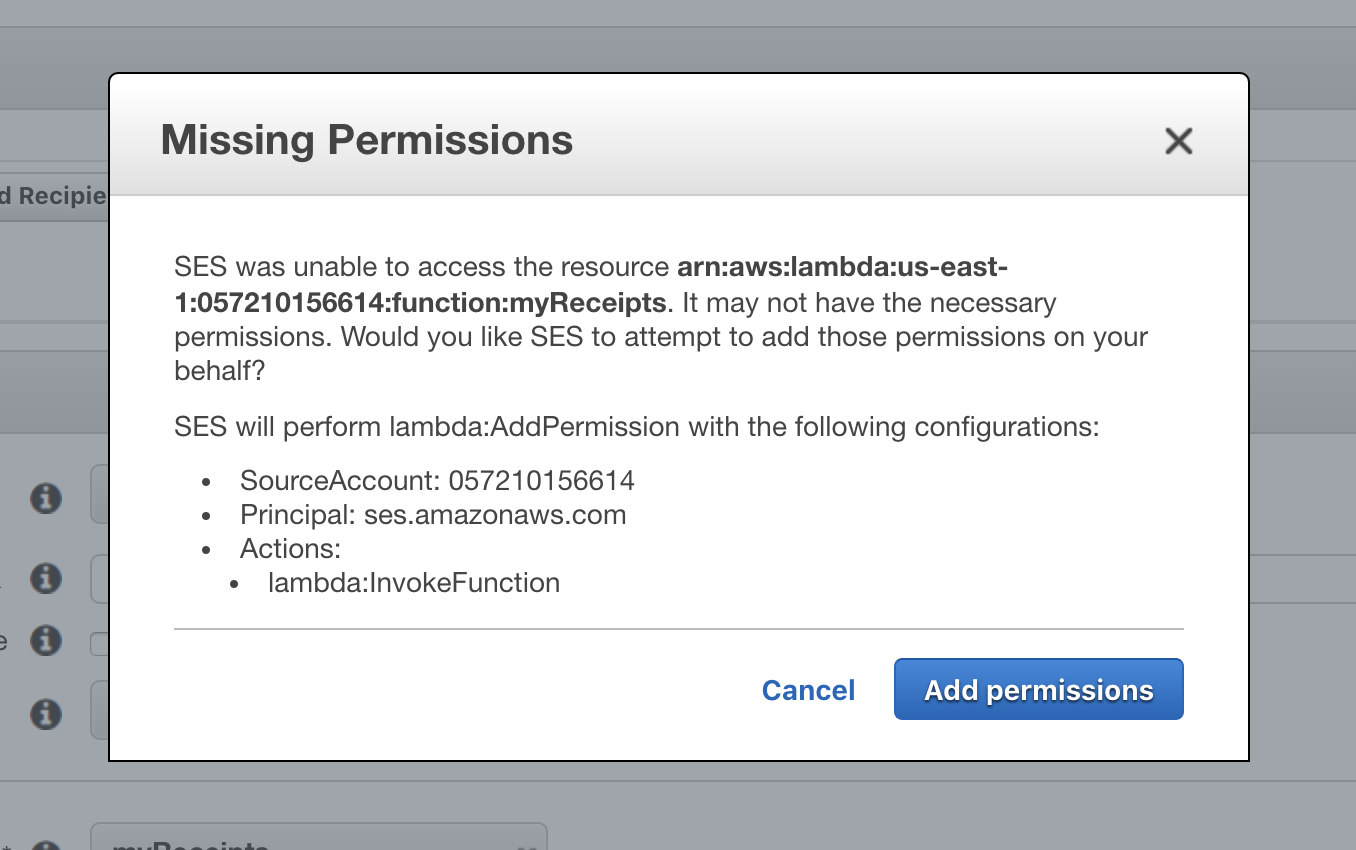 그리고, Save Rule을 선택하여 저장합니다. 아래와 같이 "Missing Permissions”라는 메시지가 나옵니다. SES가 Lambda 함수를 수행하기 위해서는 해당 함수에 대해 실행권한이 있어야 합니다. 권한이 없다는 것을 알려주며, “Add permissions”을 눌러 필요한 권한을 자동 추가합니다. 이런 안내와 부분적인 자동화 설정은 AWS 서비스를 처음으로 익히는데 매우 큰 도움이 됩니다.