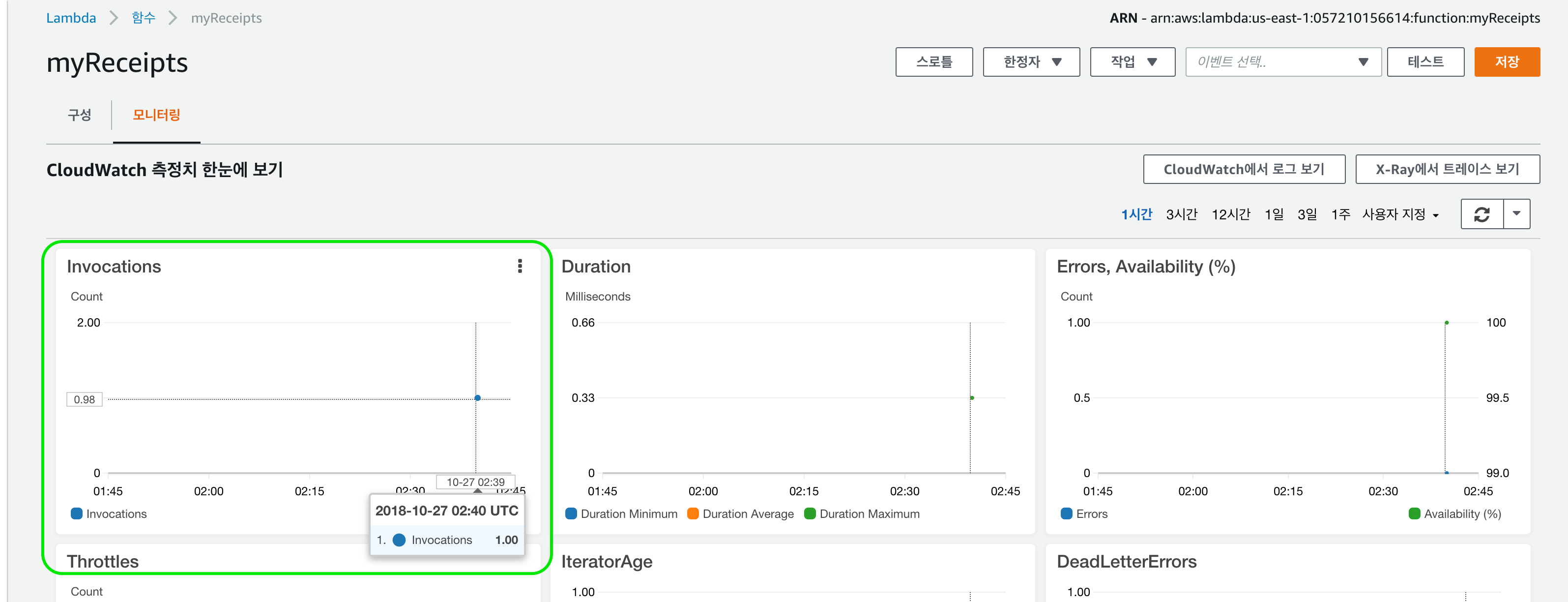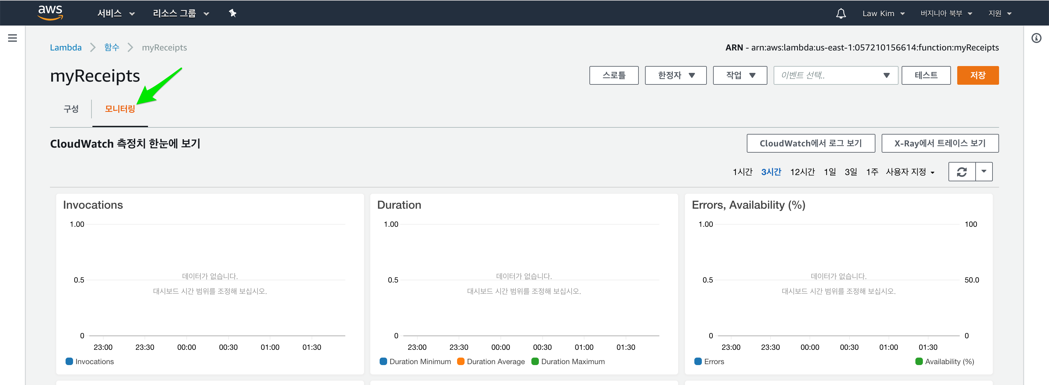 AWS Lambda 함수 페이지로 이동합니다. 우리가 작성한 myReceipts 함수를 선택합니다. 모니터링 항목을 선택합니다.