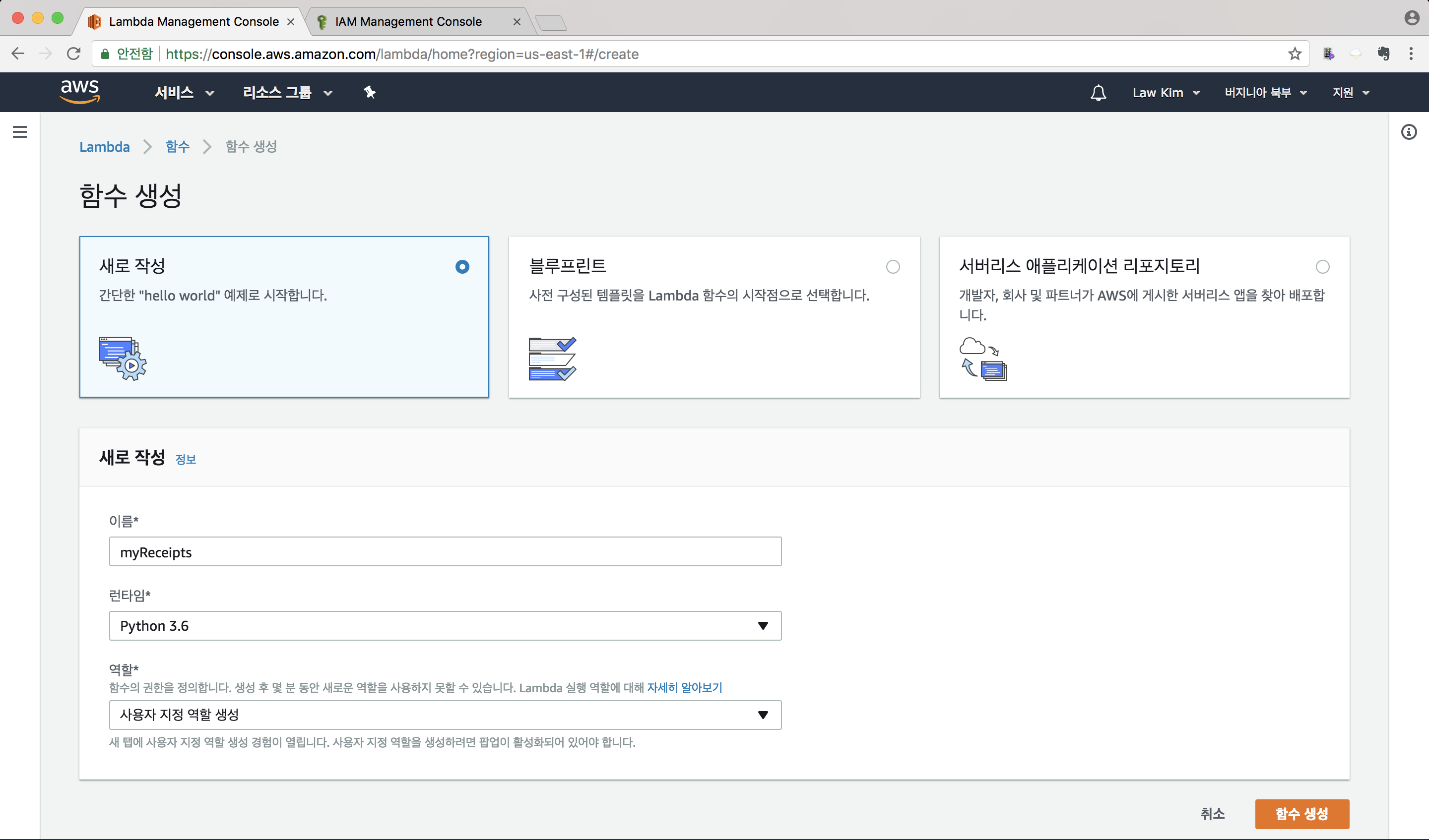 “새로 작성”을 선택합니다. 이름을 “myReceipts” 입력하고, 런타임으로는 Python 3.6을 선택합니다.