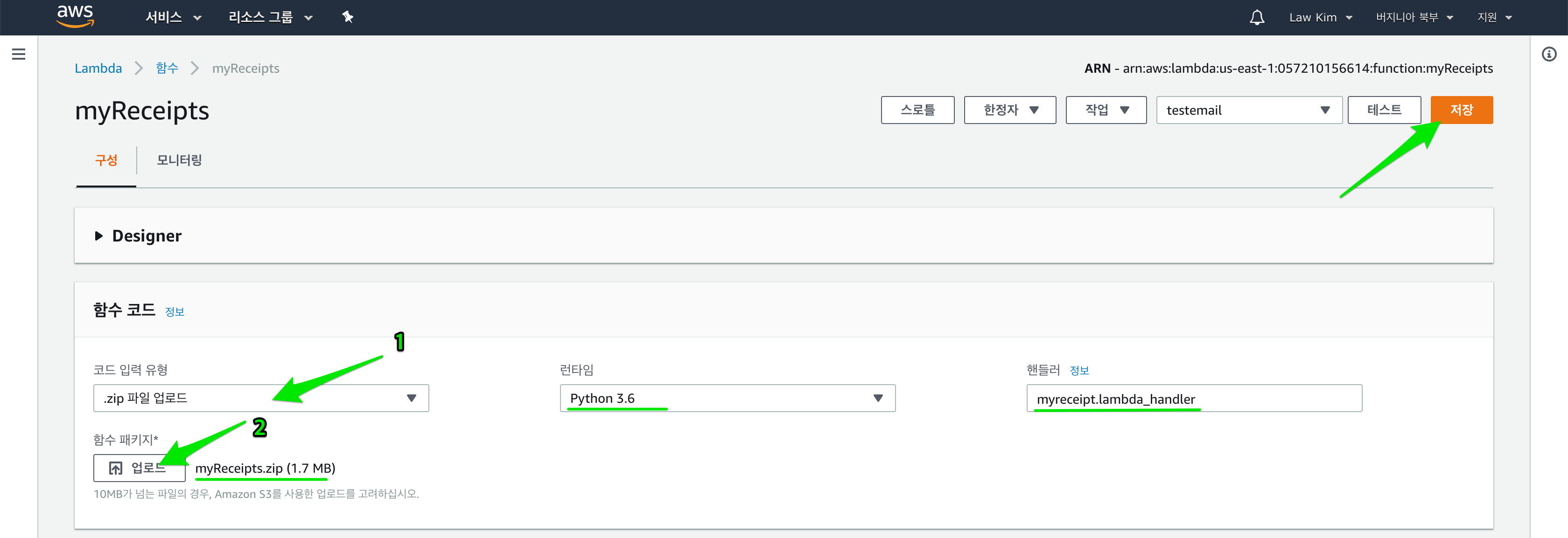 마지막으로 업로드를 누르고, myReceipts.zip 파일을 추가합니다. 1.7MB 크기네요. 저장 버튼을 누르면 파일이 업로드 됩니다. 업로드가 완료되면 압축했던 라이브러리와 파일의 내용을 편집할 수 있도록, 함수 코드 항목에서 나타납니다. PC에서 코드를 수정한 후, 압축 후 올리는 대신에, 함수 코드 화면에서 바로 편집하고 Lambda 함수를 테스트해 볼 수 있습니다.