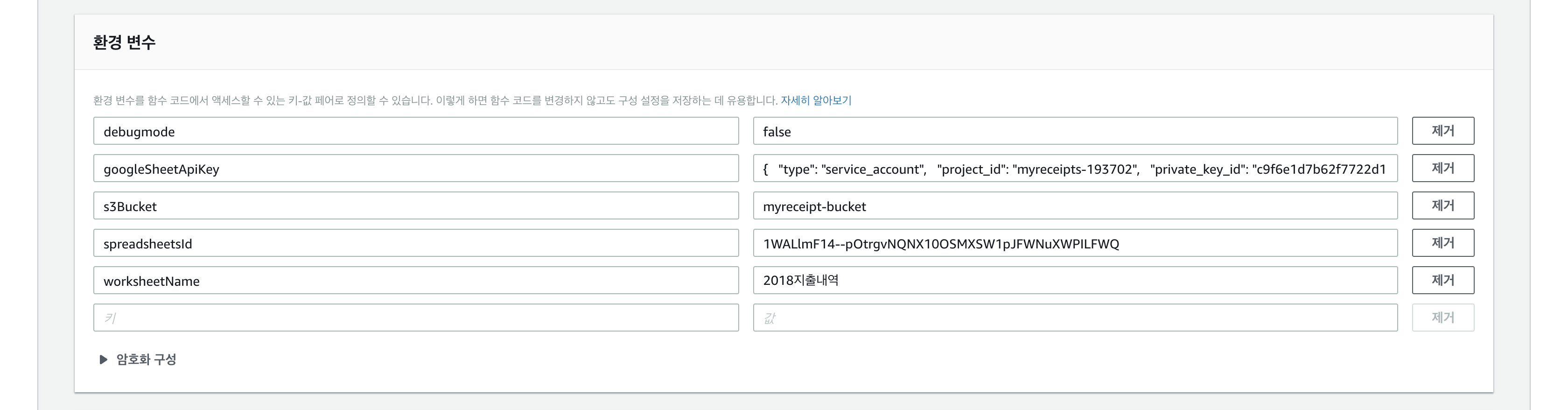 왼쪽에는 키을 오른쪽에는 키에 해당하는 값을 입력합니다. googleSheetApiKey키는 Google Spreadsheet API에는 서비스 키 생성할 때, 다운로드 받았던 개인키의 본문을 여기에 붙여넣기 합니다.