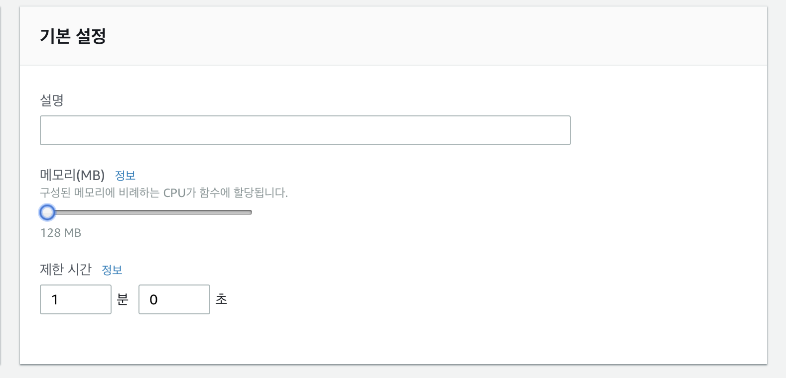 마지막으로 Lambda 함수에 대해 설정을 할 수 있습니다. 메모리는 128MB로 설정하고, 제한 시간(timeout)은 1분으로 설정합니다. 우리가 작성한 코드는 많은 메모리를 요구하지 않습니다. 다만, Google Spreadsheet API를 호출하는 과정에서 십여초가가 소요될 수도 있습니다. 이로인해 Lambda 함수가 실패하지 않도록 충분한 제한 시간을 설정합니다. 그리고, 저장합니다.