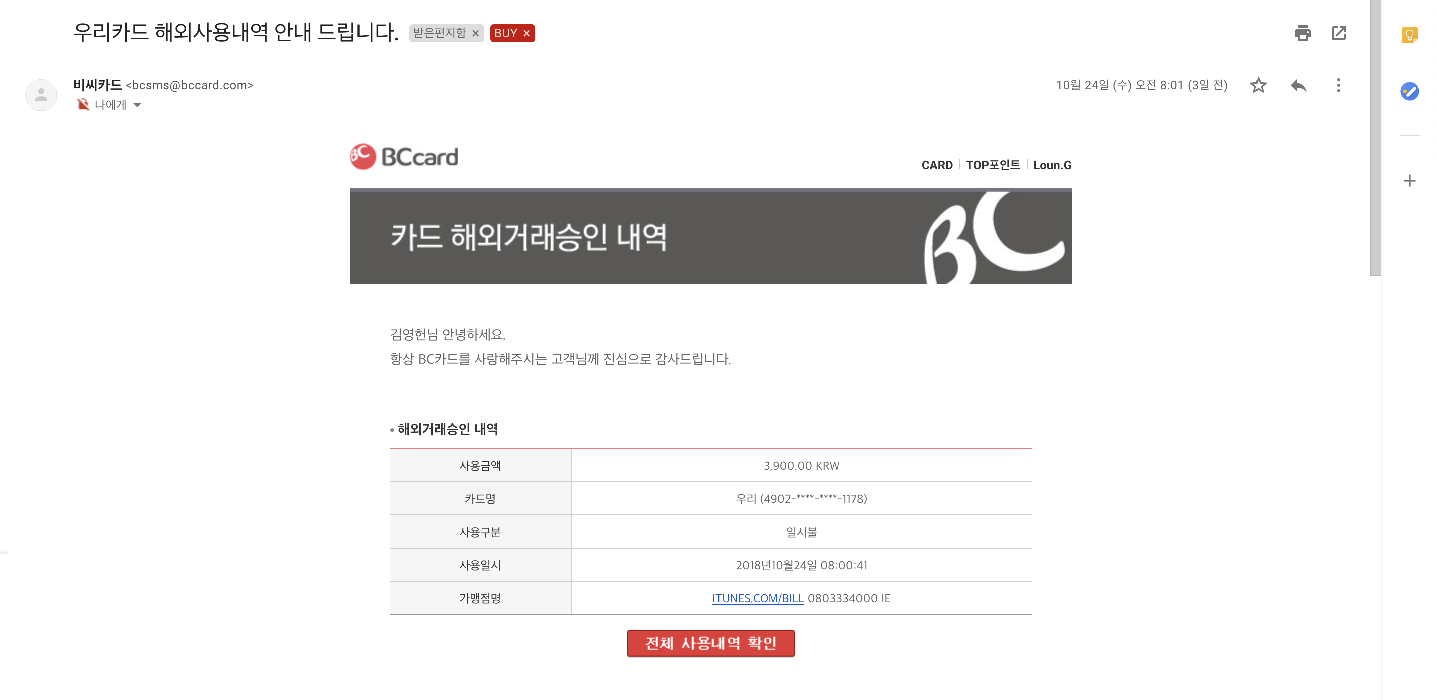 $ pip3 install bccard_parser -t .BC카드사가 발송하는 결제 이메일의 본문 내용 중 필요한 값(결제금액, 일시, 가맹점명 등)을 추출해야합니다. bccard_parser를 이용해서 HTML로 전달되는 BC카드의 결제 내용을 파싱할 수 있습니다. 필요에 따라 별도의 파서를 작성하시거나 변경하셔도 좋습니다.
