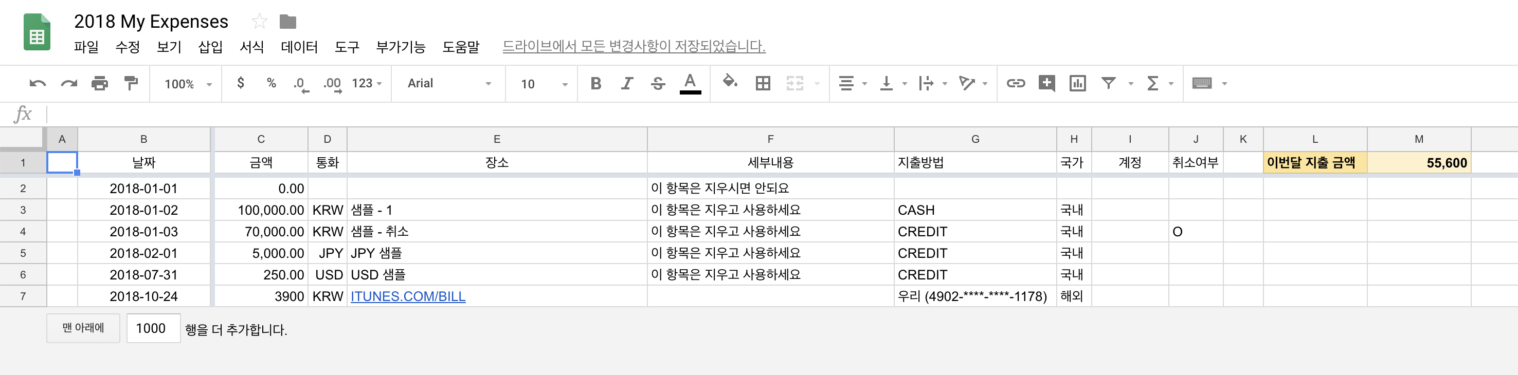 - 스프레드시트에 결제 정보를 입력합니다.