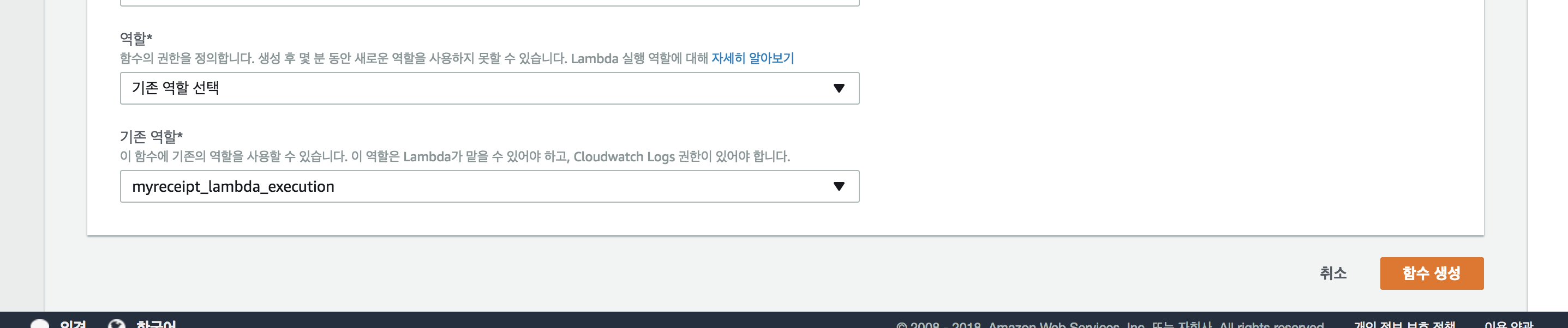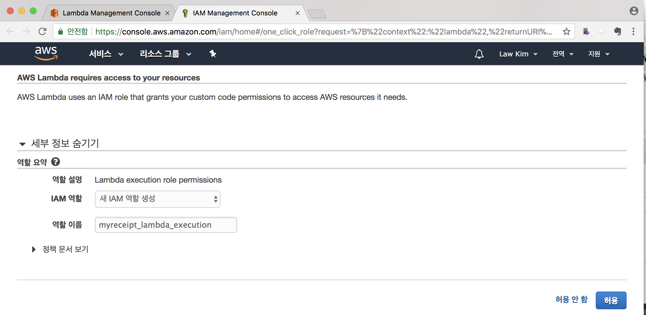 새로운 역할 이름을 입력하고, ‘허용’을 선택합니다. 이름은 “myreceipt_lambda_execution”으로 하였습니다.