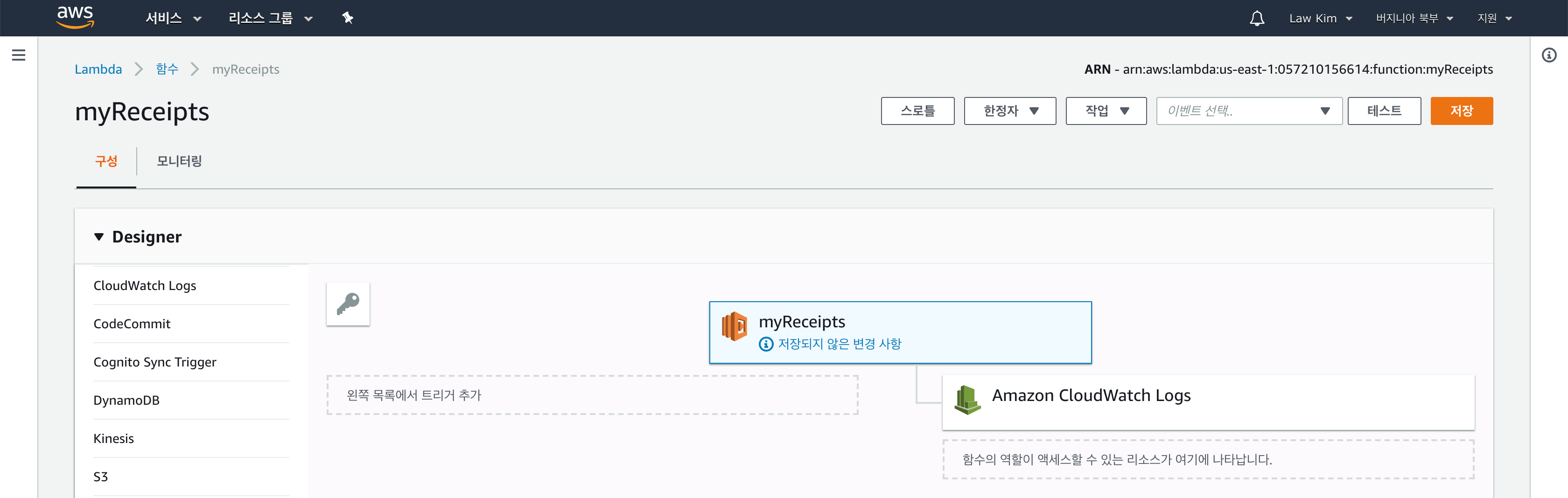 다음 그림과 같이 “myReceipts” Lambda 함수가 생성되었습니다. 우측 상단의 “테스트”를 클릭하여 helloworld 예제를 바로 실행할 수 있습니다. 이제 우리가 필요한 서비스를 연결하고 코드를 업로드하면 카드 결제 정보를 수집할 수 있겠죠?
