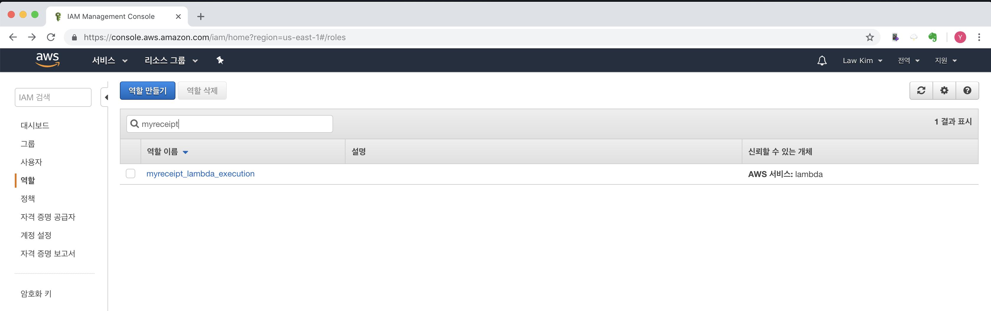 검색에서 myreceipt를 입력 후 검색을 수행합니다. 앞서 만들었던, myreceipt_lambda_execution 역할을 찾을 수 있습니다. 선택합니다.