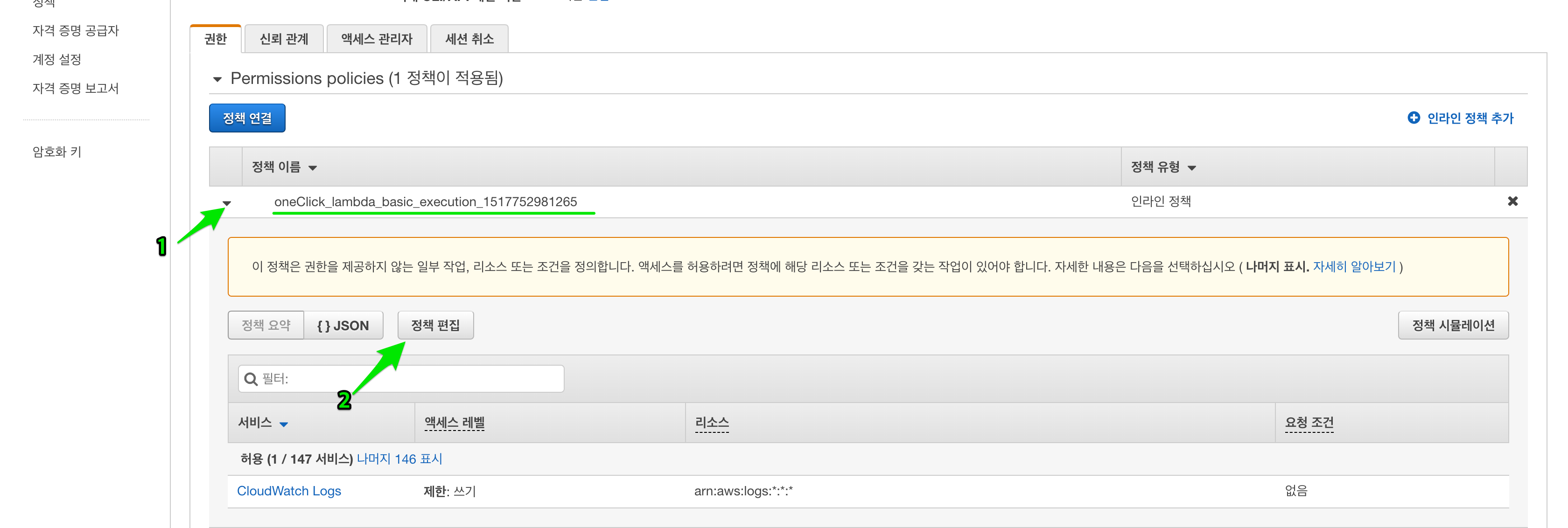 oneClick으로 시작하는 정책(Policy)이 하나 있습니다. 왼쪽 화살표를 선택하여 속성을 확장합니다. “정책 편집” 버튼을 눌러 권한을 추가하겠습니다.