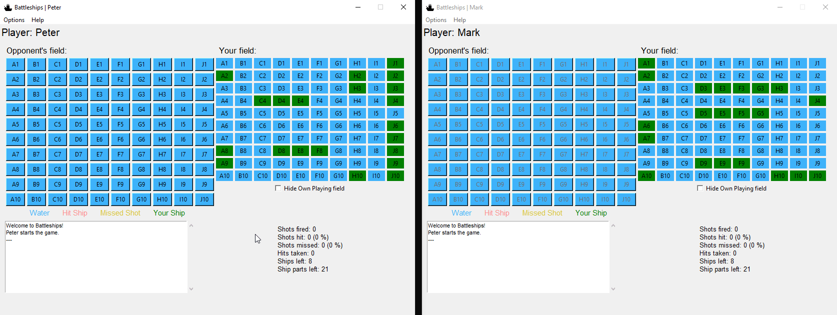 Once the second player finishes their ship placements, the two main game windows are opened.