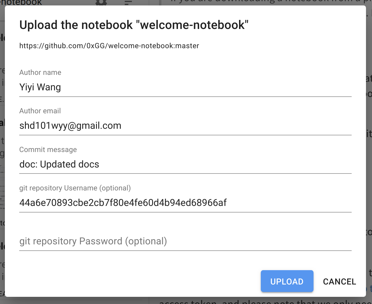 When you upload a notebook, you may need to fill in your (Git repository) Username and (Git repository) Password.