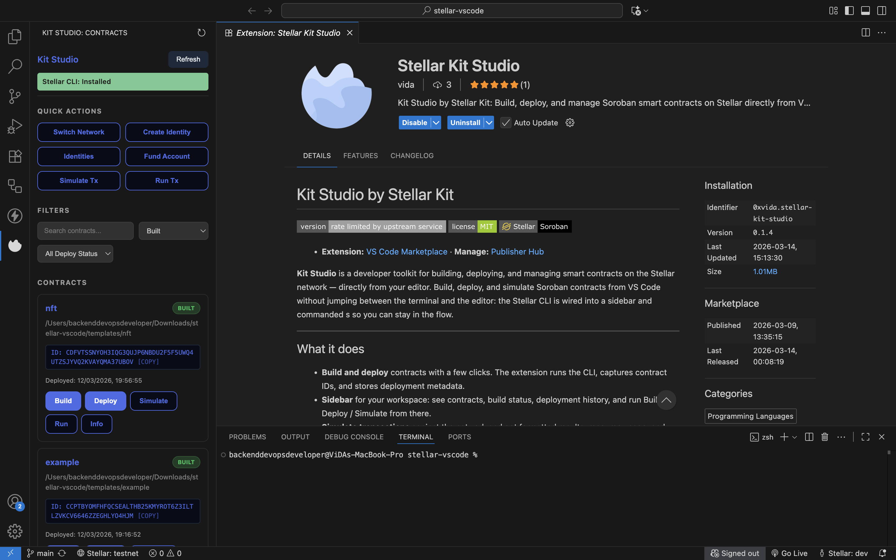 Kit Studio is a developer toolkit for building, deploying, and managing smart contracts on the Stellar network — directly from your editor. Build, deploy, and simulate Soroban contracts from VS Code without jumping between the terminal and the editor: the Stellar CLI is wired into a sidebar and commanded s so you can stay in the flow.