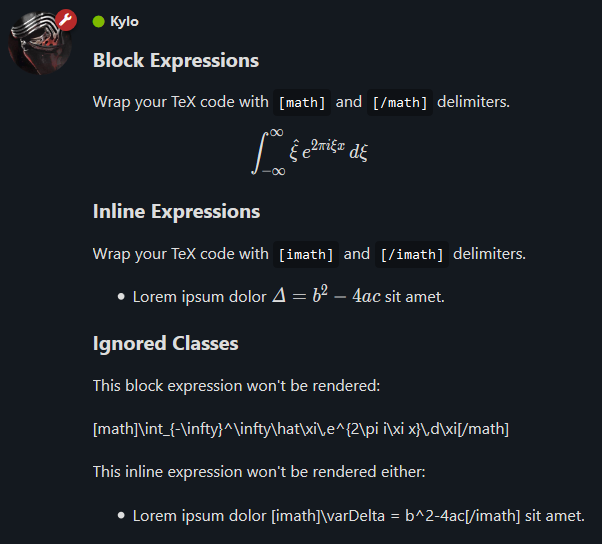 ignoreby default. But you can change it or assign multiple keywords from the settings page. You must write one of these keywords next to the special right delimiter (i.e.$$...$${keyword},\(...\){keyword}) with curly brackets or inside a BBCode (i.e.[math=keyword]...[/math]). Note that[math]%e%[/math]{keyword}is an example of invalid usage.