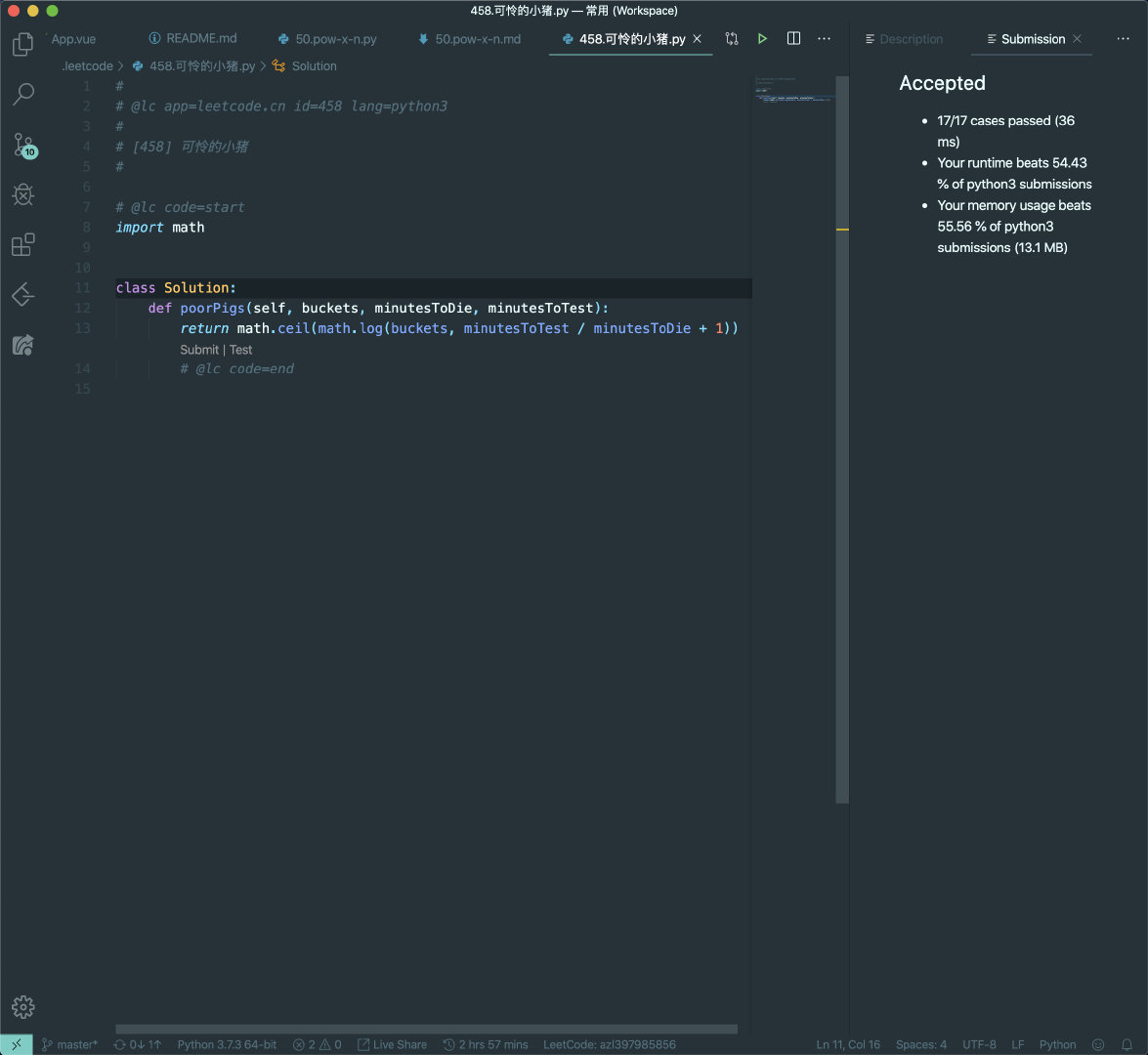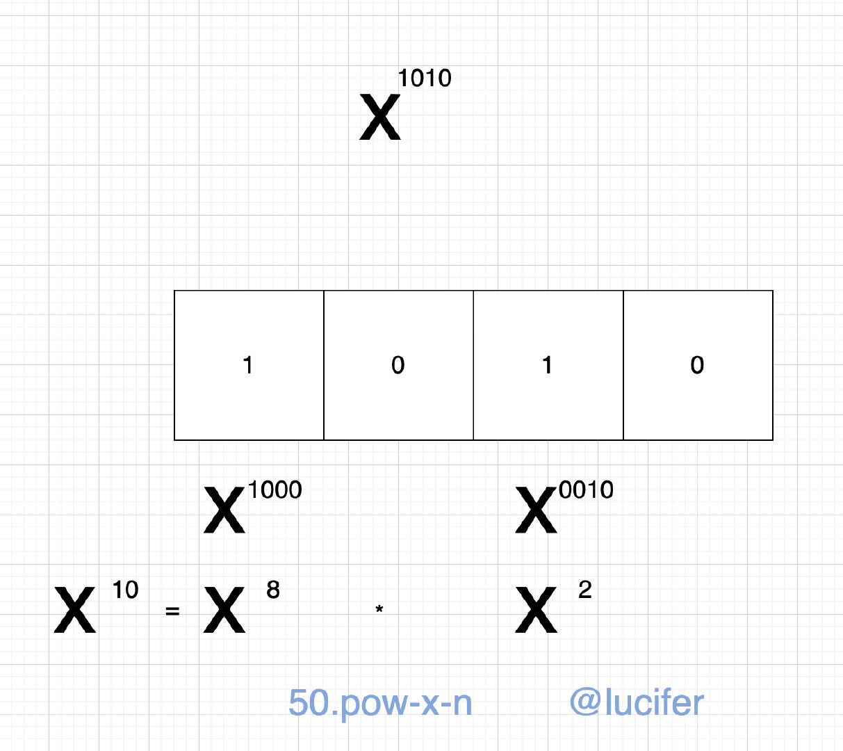 return self.myPow(x _ x, n // 2) if n % 2 == 0 else x _ self.myPow(x, n - 1)我们来从位(bit)的角度来看一下这道题。如果你经常看我的题解和文章的话,可能知道我之前写过几次相关的“从位的角度思考分治法”,比如 LeetCode 458.可怜的小猪。