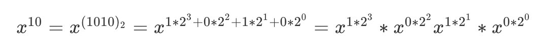 以 x 的 10 次方举例。10 的 2 进制是 1010,然后用 2 进制转 10 进制的方法把它展成 2 的幂次的和。