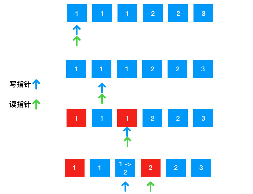 - 如果不一致,我们需要将 fast 指针的数据写入到 slow 指针。