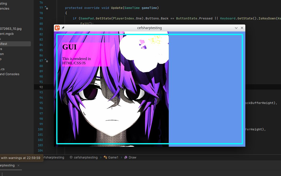 An example project using Puppeteer Sharp to achieve cross platform UI in Monogame. This allows websites to render on top of the game, so you could in theory make your game's UI in HTML/CSS/JS or whichever framework you use (really anything that works on the web). This is what we are currently trying to achieve in Contraband Software's planned Rock Engine.