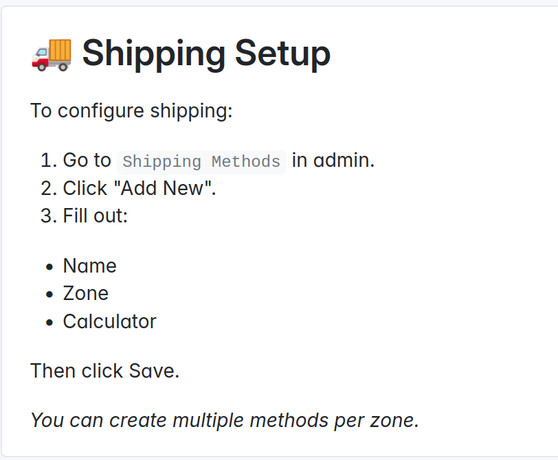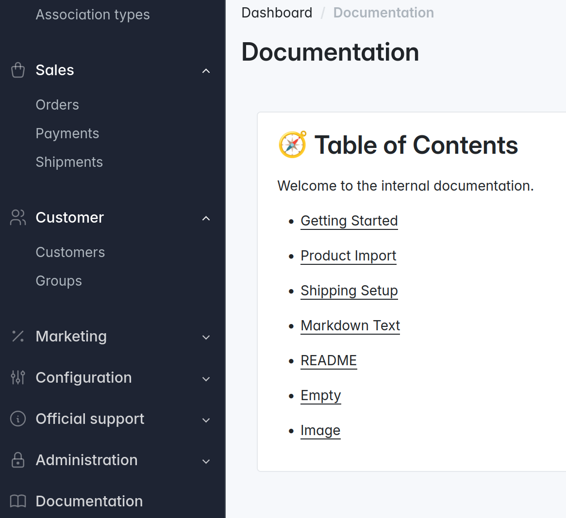documentation/index.mdlike so:# 🧭 Table of Contents Welcome to the internal documentation. - [Getting Started](getting-started.md) - [Product Import](product-import.md) - [Shipping Setup](shipping-setup.md)