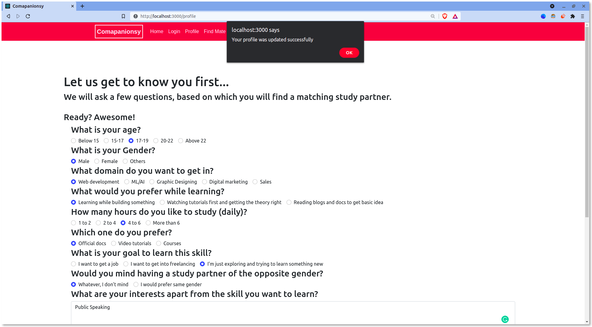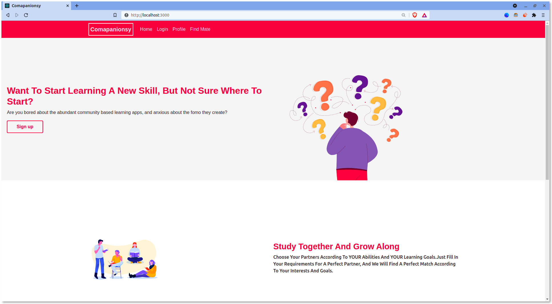 Comapanionsy is a web app which will help you find a study partner, according to YOUR capabilities and who is at a similar level as yours. Once you find a great study partner, you both can learn and grow together while having fun simultaneously.