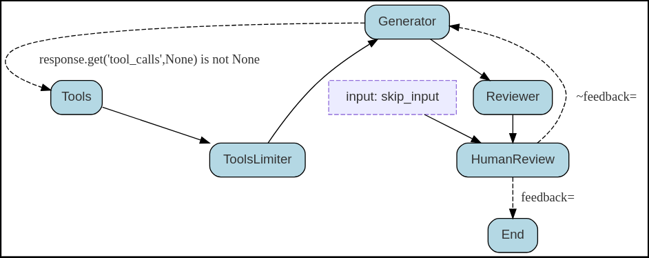 ("HumanReview", "Generator", ~when(feedback="")),