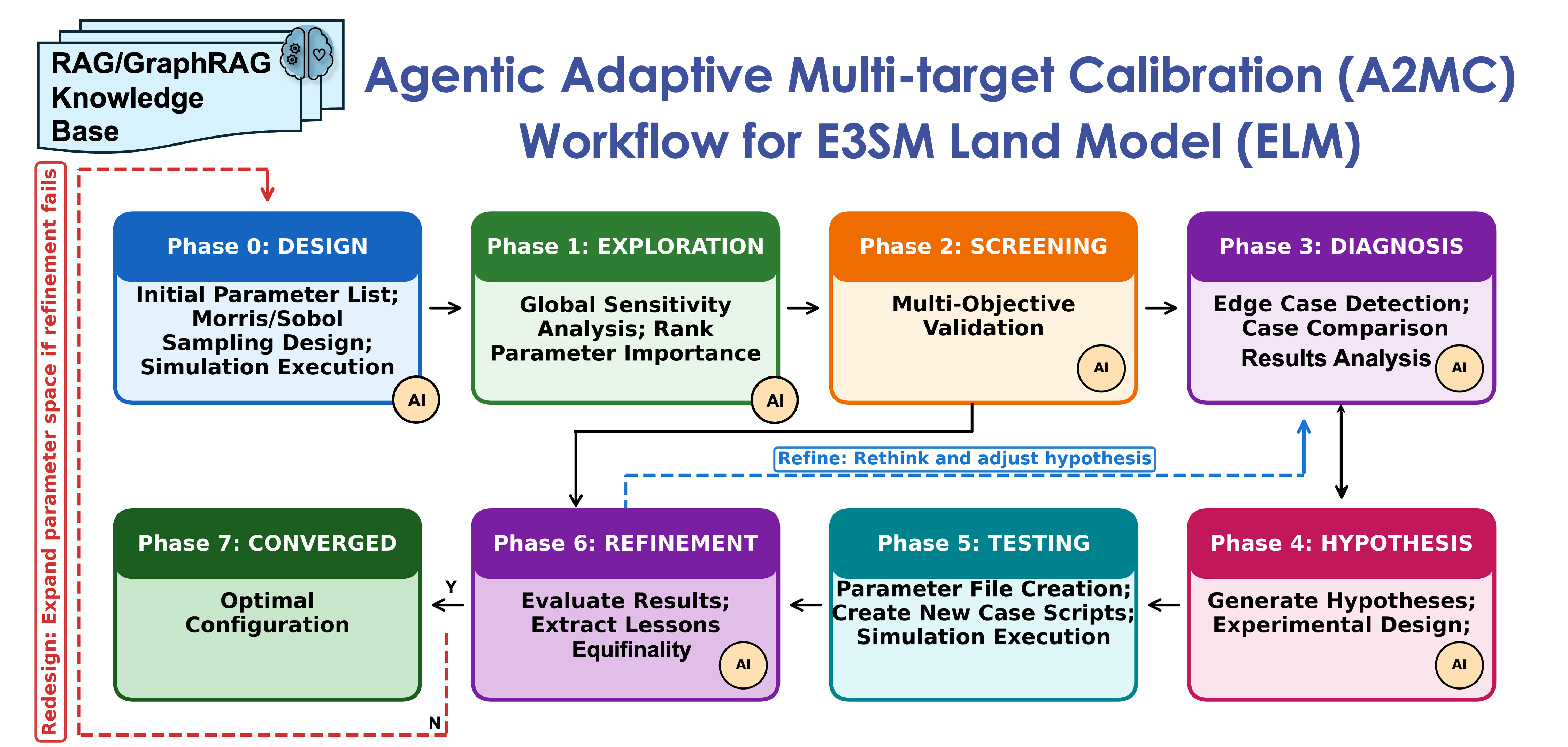 - AI-powered root cause diagnosis. When calibration targets are not met, an LLM reasons over simulation outputs augmented with model-specific RAG/GraphRAG context (e.g., 2,707 documentation chunks, 1,299-node knowledge graph with 2,200 edges for ELM-FATES) to identify mechanistic causes, e.g., diagnosing that arctic graminoid fine-root biomass is under-predicted due to P-limitation in the nutrient competition mechanism.