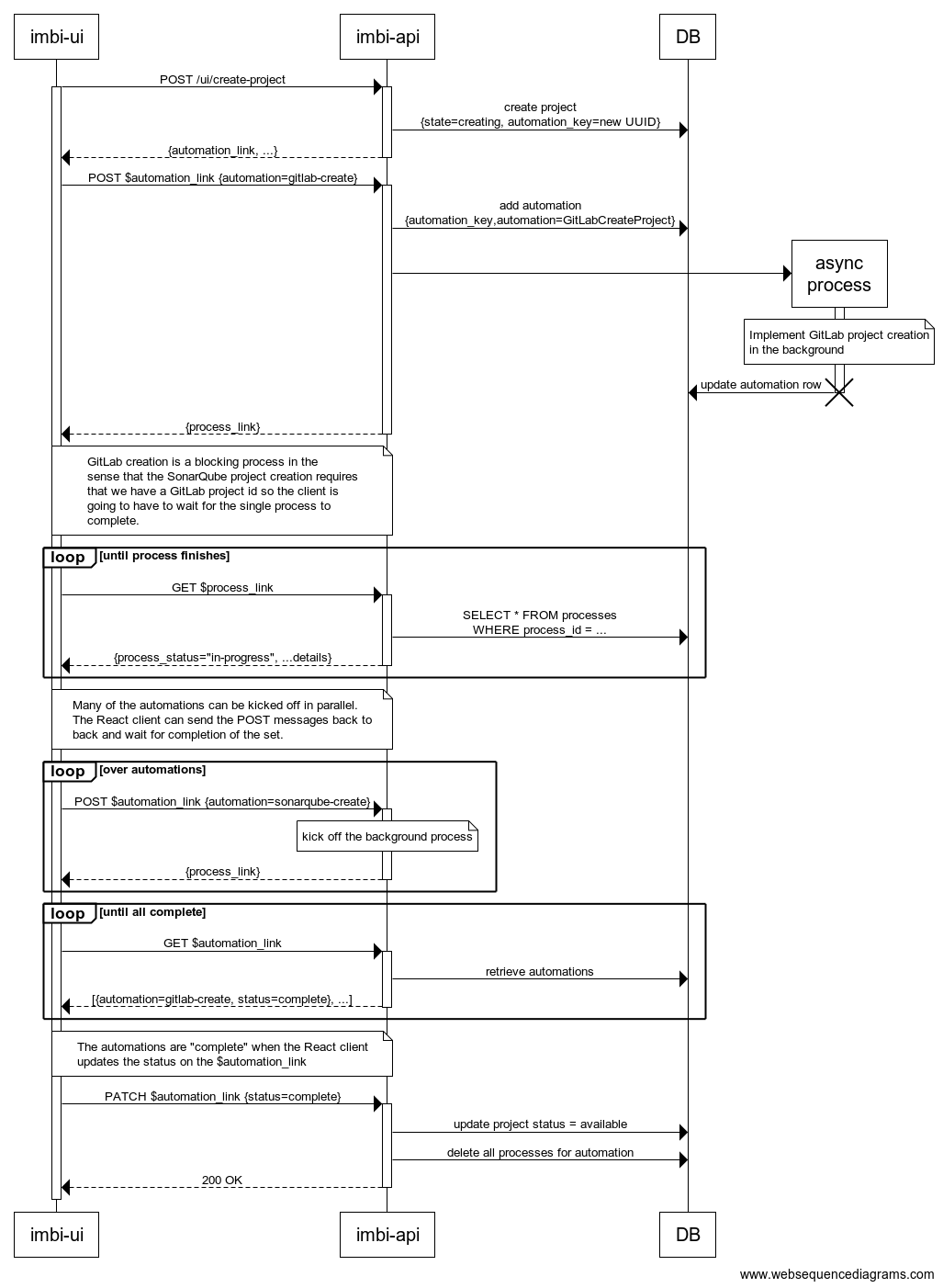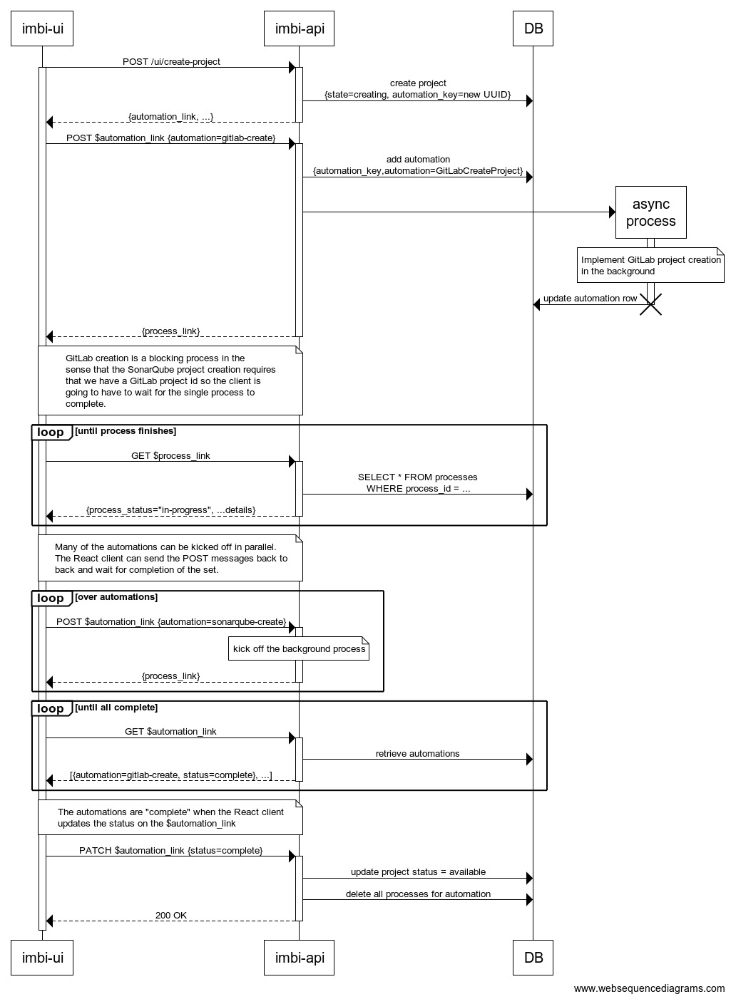 The sequence would look something like the following sequence. This looks quite a bit more complex than it actually is. The automations are hypermedia driven so we can actually implement this off to the side of the Imbi API server if we want.