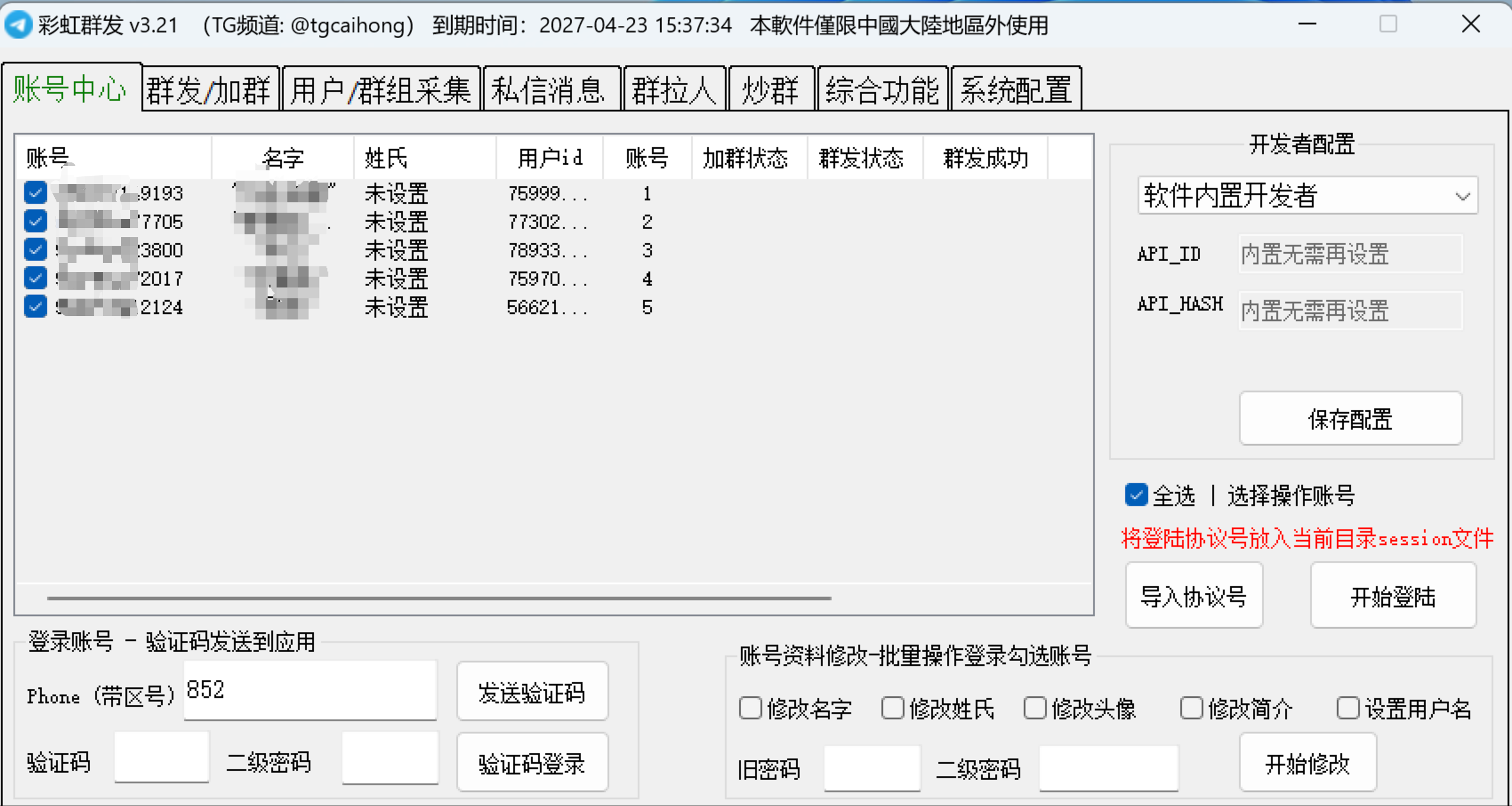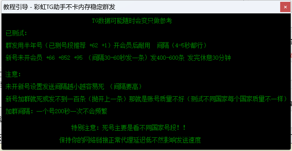 | 彩虹群发、强拉、炒群破解版(送便宜号商地址) | 官网地址,使用教程:视频教程,自助购买: https://shop.tg10000.com/buy/1 | ¥199 |