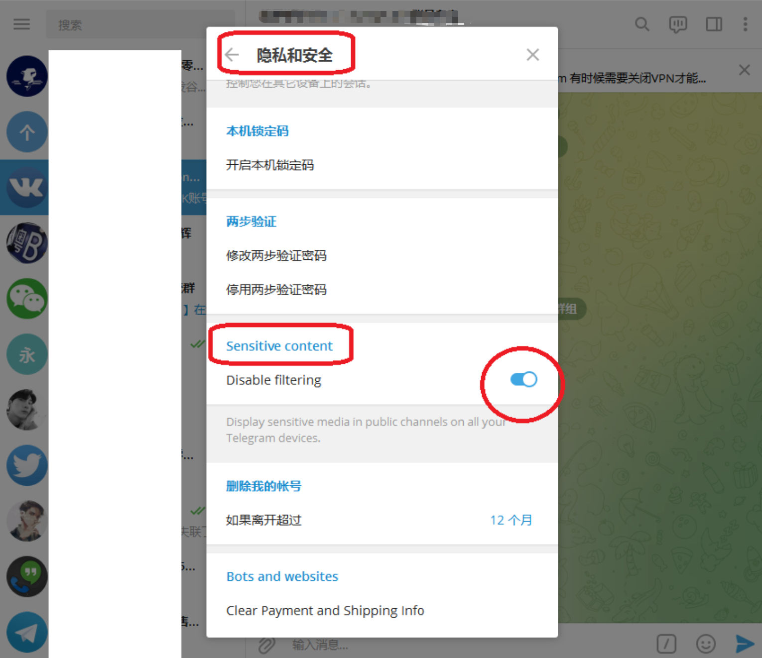 方式 a:打开 windows 电脑桌面客户端, 左上角三短线: 设置→隐私安全→开启 ” 显示含有敏感内容的媒体 ”