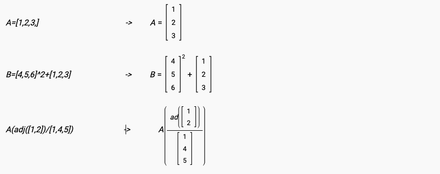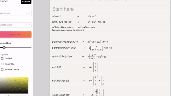 The equation formatting features supports all Algebric, triagnometric and Matrices formatting, following with prefix " $ ".