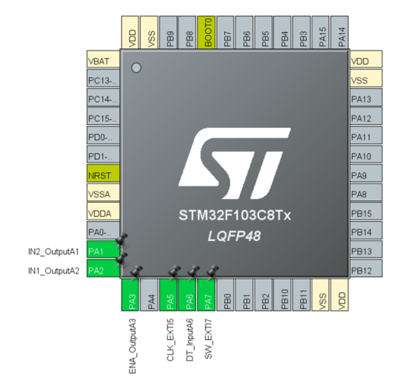 The external interrupt (EXTI) pins are encoder’s CLK and SW pin. CLK is in the mode with Rising edge trigger detection and SW is in the mode with Rising/Falling edge detection. The input pin is also encoder’s DT pin and the output pins are pins that are connected to the Motor driver, IN1, IN2, and ENA.