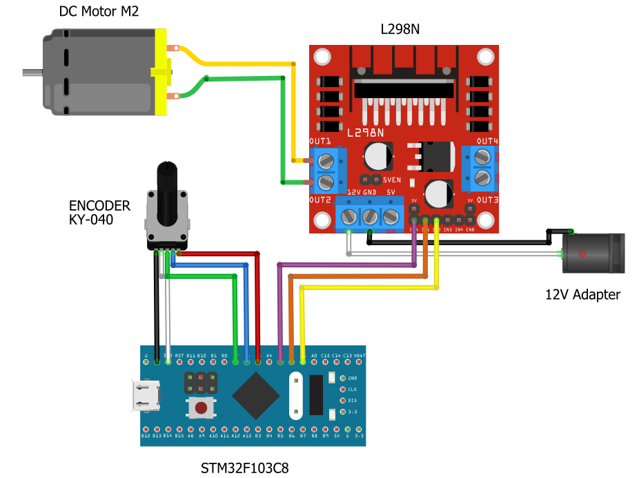 L298N pins are connected to the STM32F103C8 GPIO pins according to Table 3, OUT1 and OUT2 pins are connected to the DC Motor and two pins for power supply VCC and GND are connected to the 12V adapter.