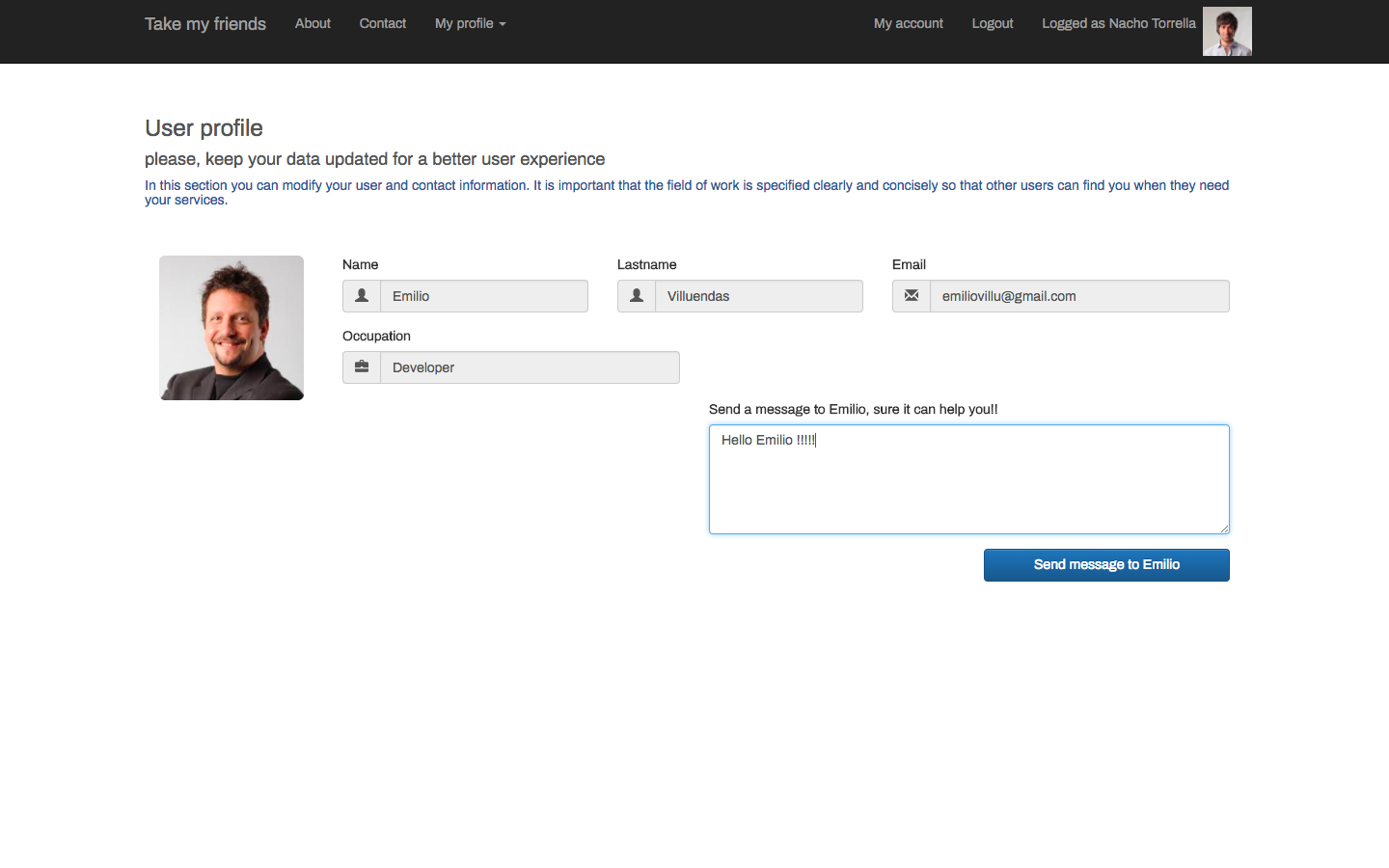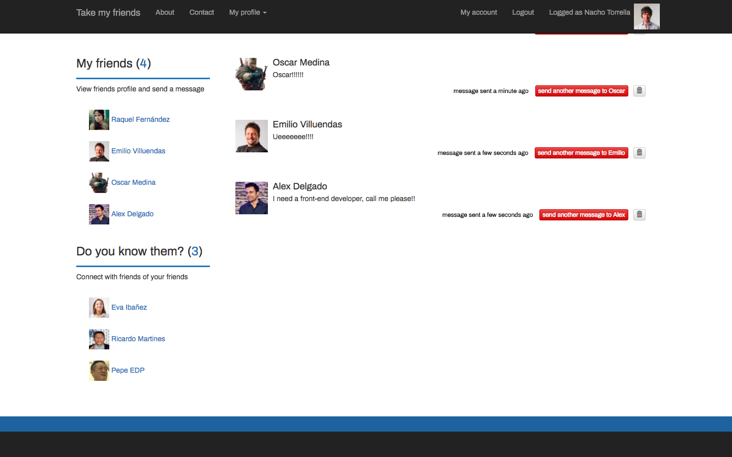 It is based on an idea similar to Facebook and LinkedIn through which we can create a social network of friends in which to find who works in a particular sector. The idea is to find in your circle of friends who works in a certain sector and to be able to contact with him to request some kind of collaboration.