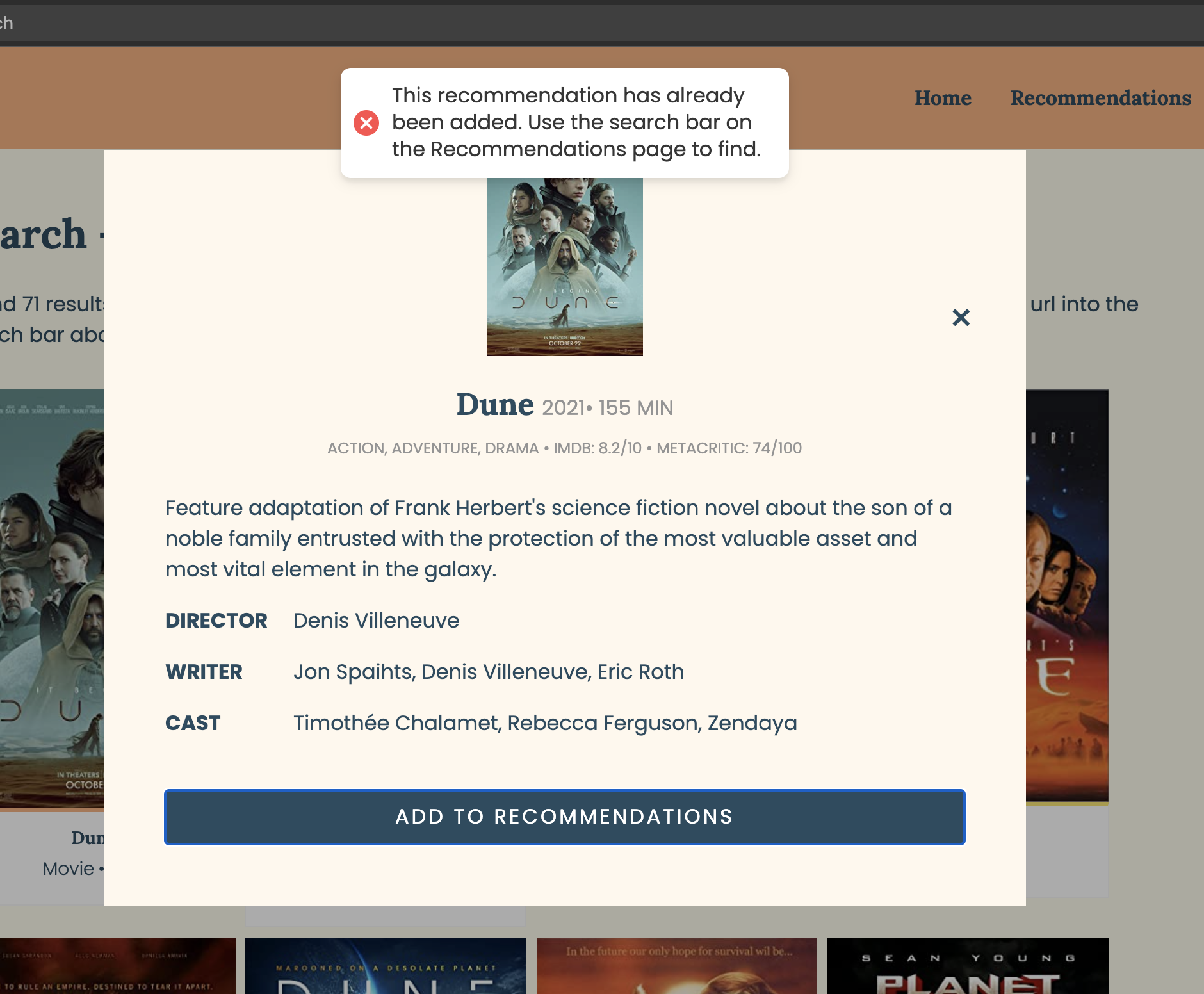 This task will redirect to a recommendation page if a film/tv show/game already exists in the database.