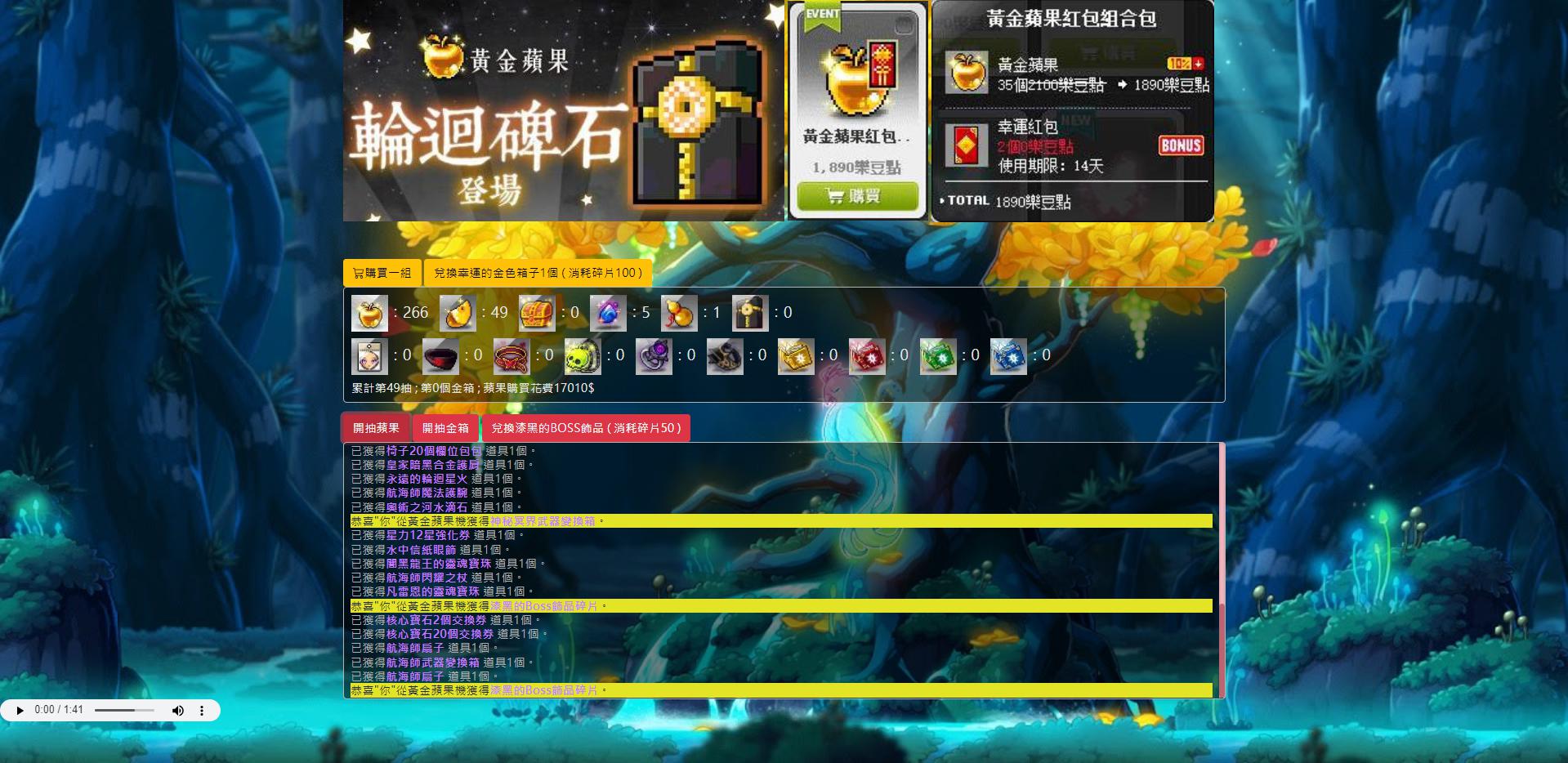 - 當「黃金蘋果碎片」達100個時,可兌換「幸運的金色箱子」1個,並顯示數量在「道具欄」