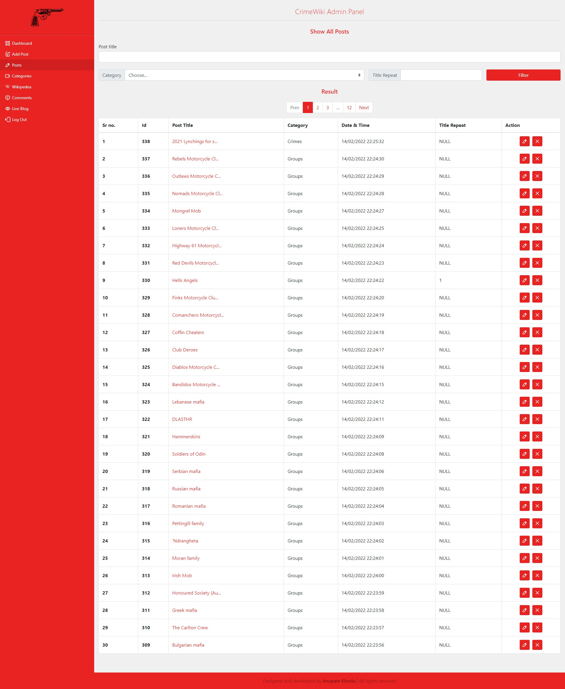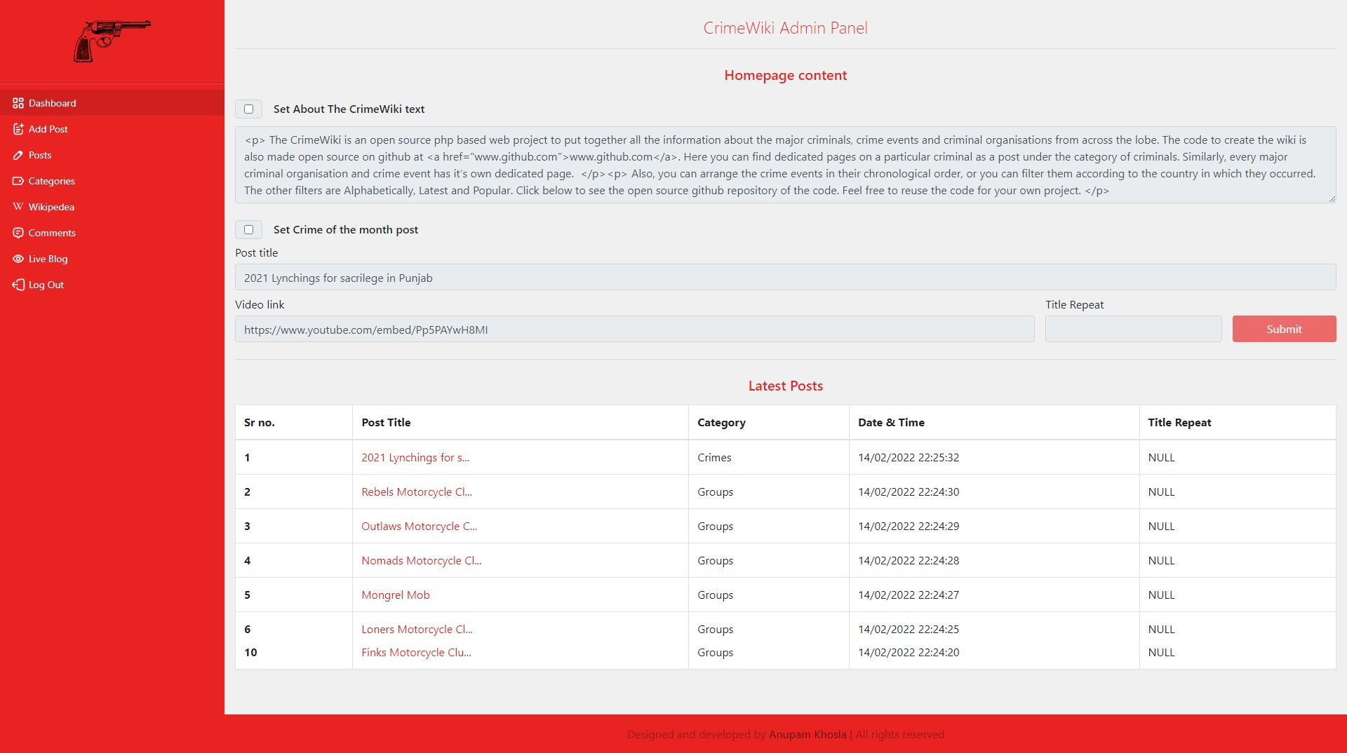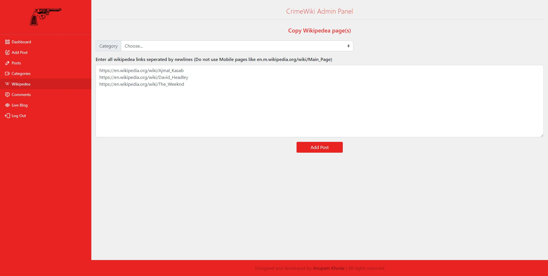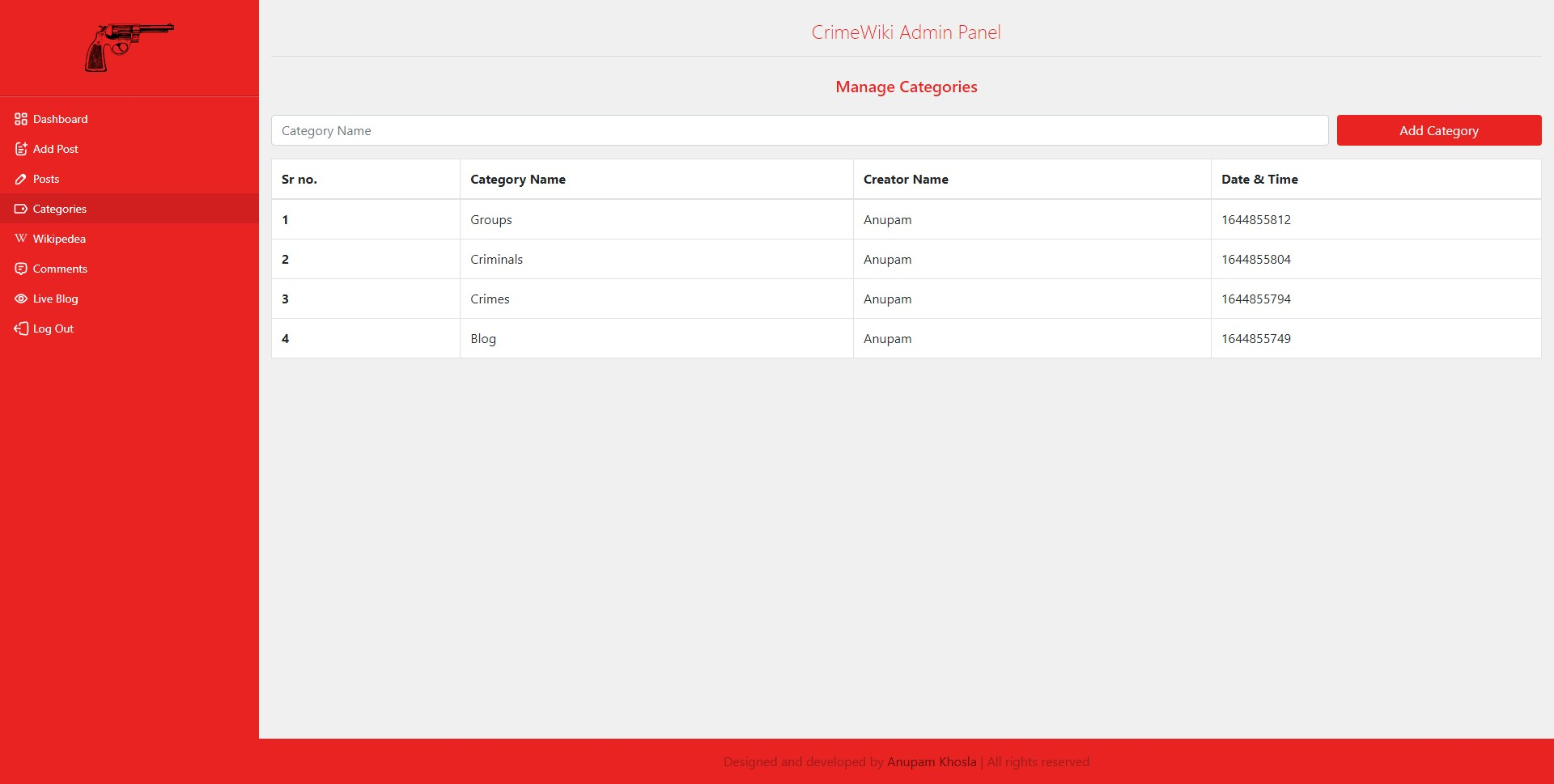 Criminals. Homepage will showCriminalscategory by default. - Add a minimum of one post through yourdomain/wikipedea.php or yourdomain/addpost.php.