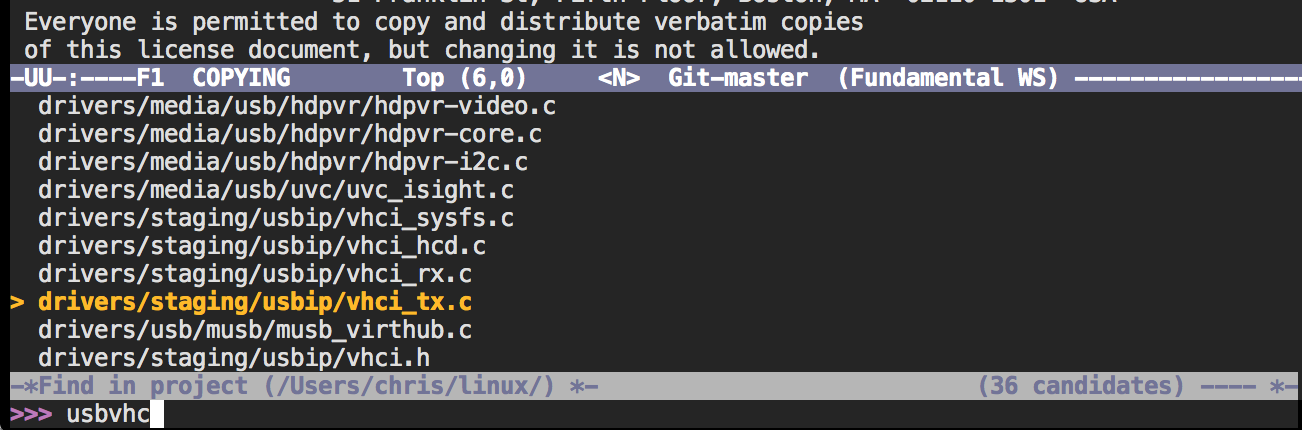 (grizzl-completing-read "Number: " *search-index*)The user is presented with the minibuffer and a list of matches, starting with all possible matches. As the user types, the list is reduced by repeatedly fuzzy searching in the index. The selection within the matched results can be changed by using the UP and DOWN arrow keys or C-p and C-n. The user hits ENTER to select the matching result.