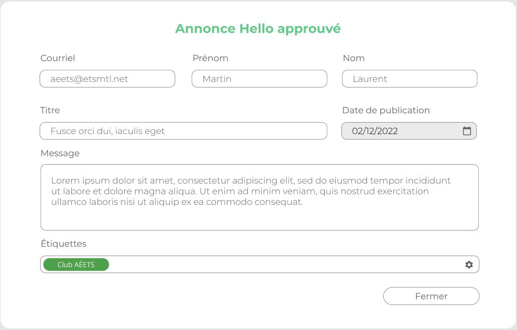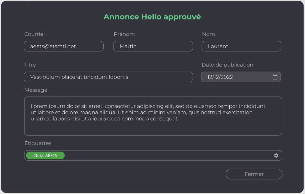 **Should contain :** * Title * Email * Name * Lastname * Title * Publication date * Message * Tags * Close button All fields should be read only **Inspiration :**