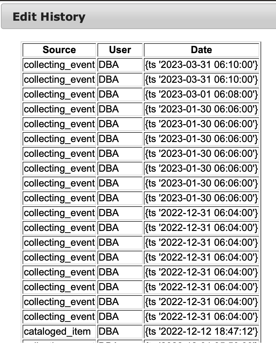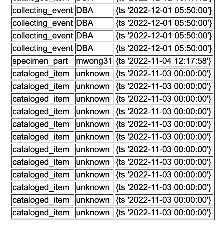 I often use the "last edited by" on pages to find out when tissues were scanned, just to update some records. However, the box that opens with "last edited by" has rows and rows that are meaningless. How is "collecting_event | DBA | {ts '2022-12-31 06:04:00'}" at all useful for specimen curation? A line like "specimen_part | mwong31 | {ts '2022-11-04 12:17:58'}" is useful to me since I know mwong31 scans tissues tubes for us. But even that line is not very informative.
