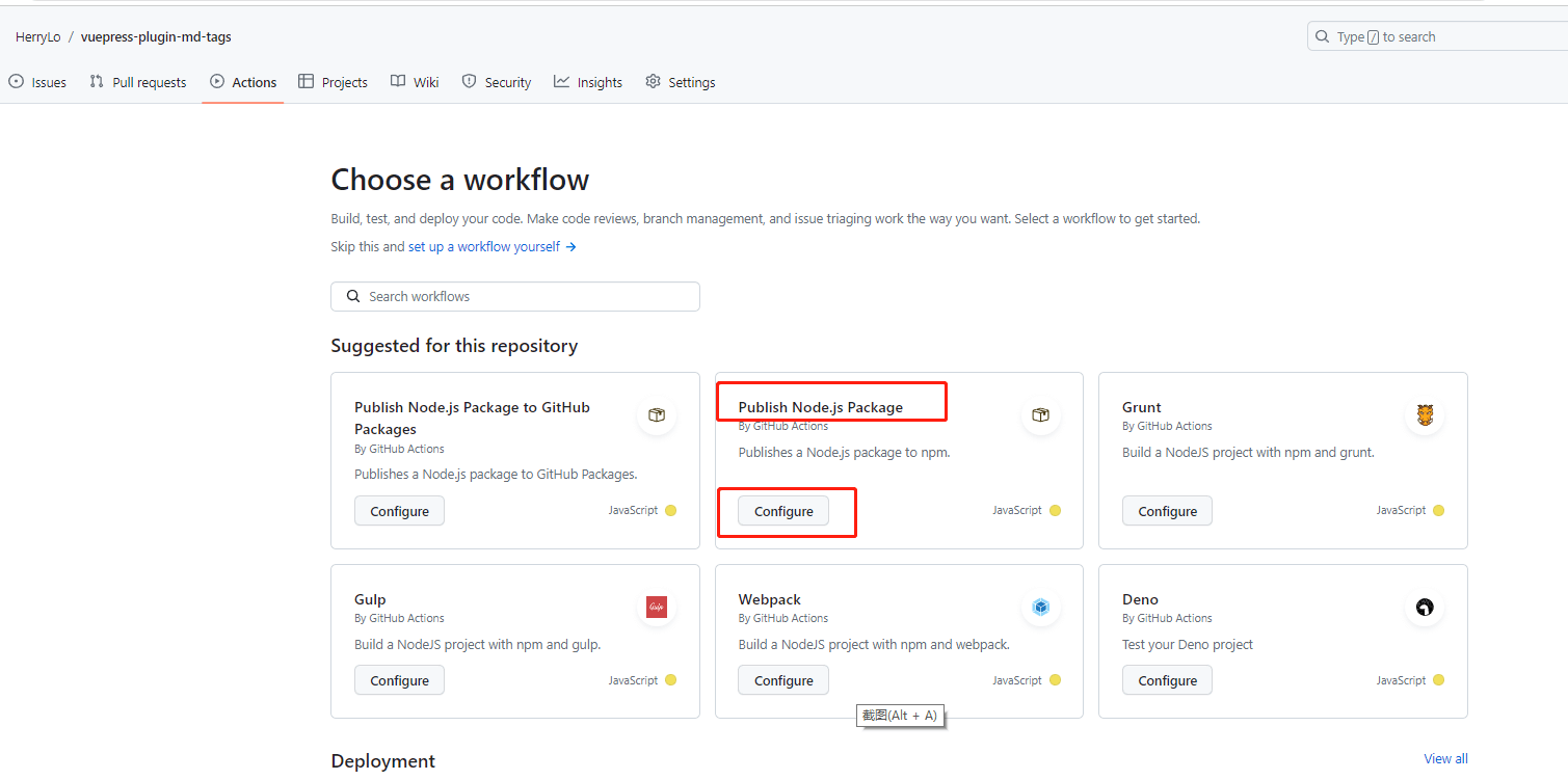 生成你自己项目的Github Action配置文件,Github有提供模板,选择图片中框出的模板即可