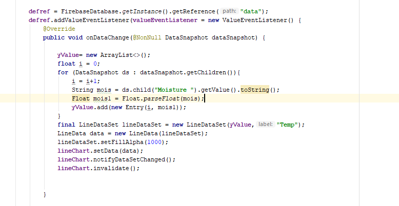 Hello anyone can help me ? i cant retrieve this data from firebase and show in the Line graph apps. This code i try to retrieve moisture data first to test. but cant retrieve.