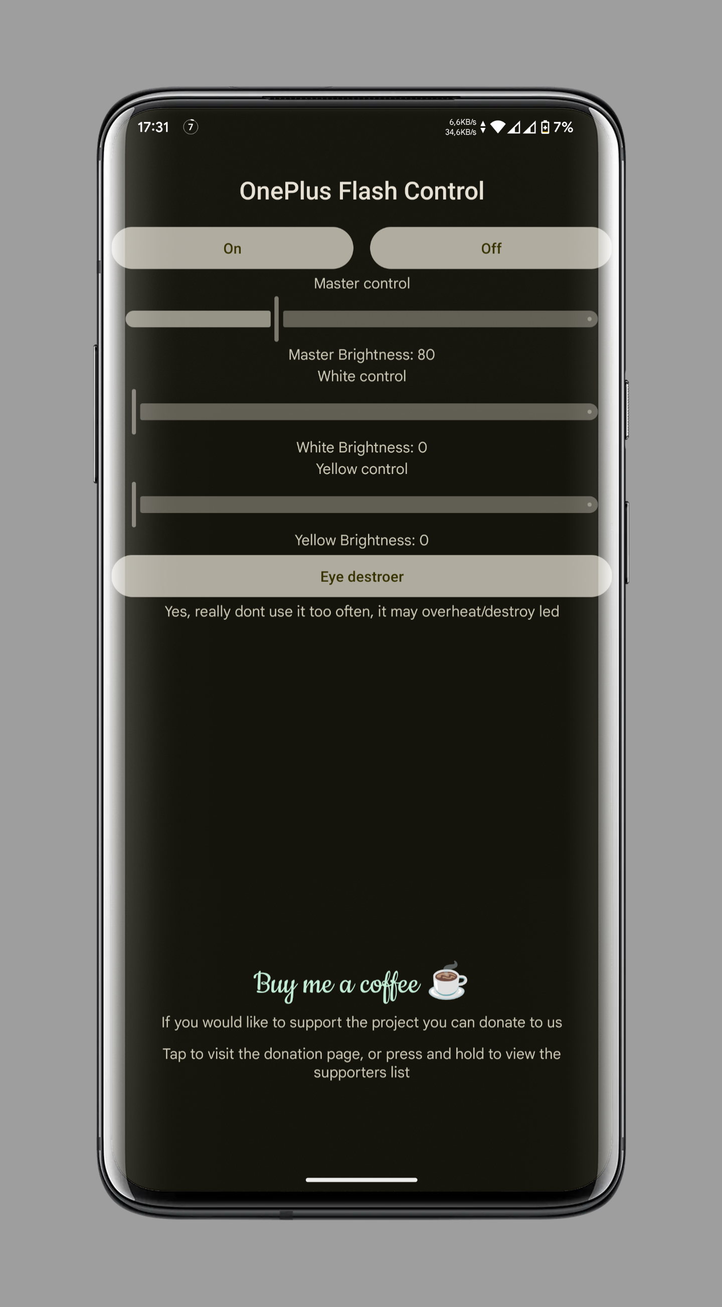 Once installed on your rooted OnePlus device, you have full access to all features. The main screen provides sliders for adjusting the master brightness (0-500), as well as the brightness of the white and yellow LEDs individually. You can turn the flashlight on and off, and access the "Eye Destroyer" mode for maximum brightness.