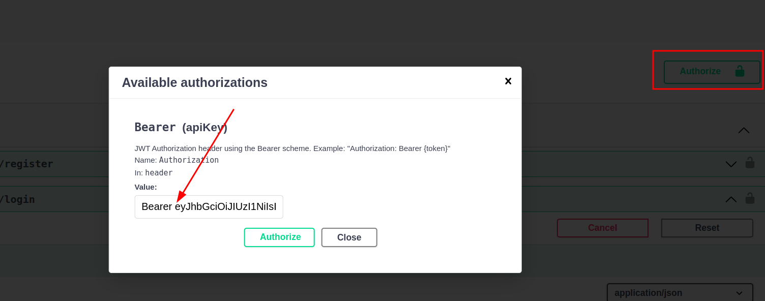 Scroll to the top of the page and click on the Authorize button on the right. Once the popup opens, input Bearer followed by the token and click Authorize again.