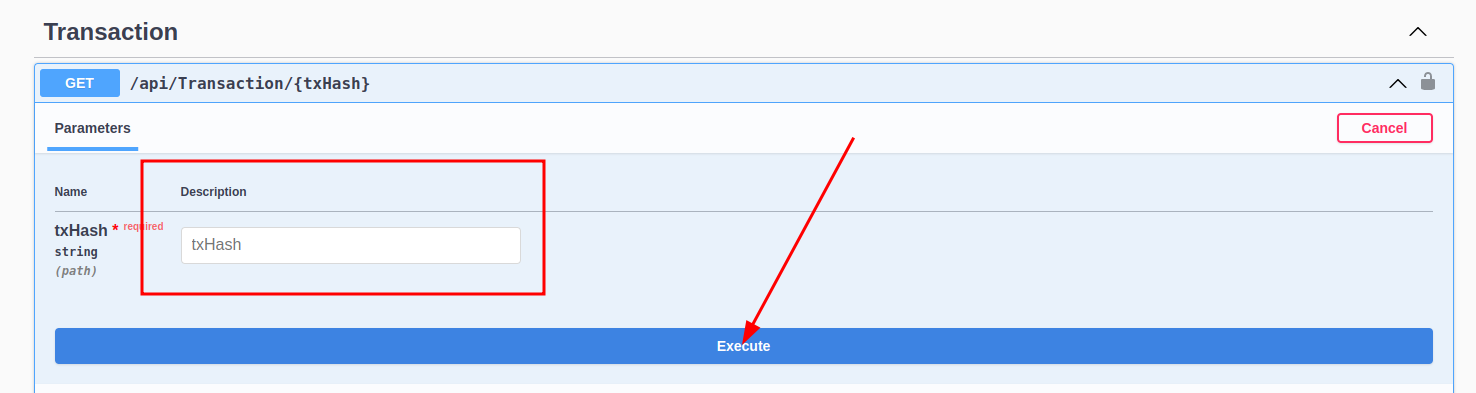 Test the authorization by expanding the transaction api/Transaction/{txHash} endpoint, inputing a tx hash and clicking on execute