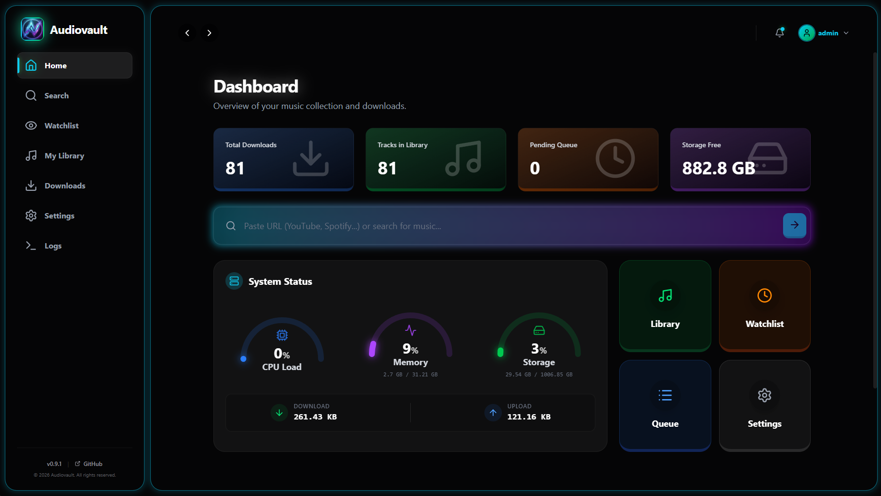 Audiovault is a powerful, self-hosted application designed to import, manage, and download your music libraries from any major streaming platform directly to your local server. Built with performance, aesthetics, and reliability in mind.