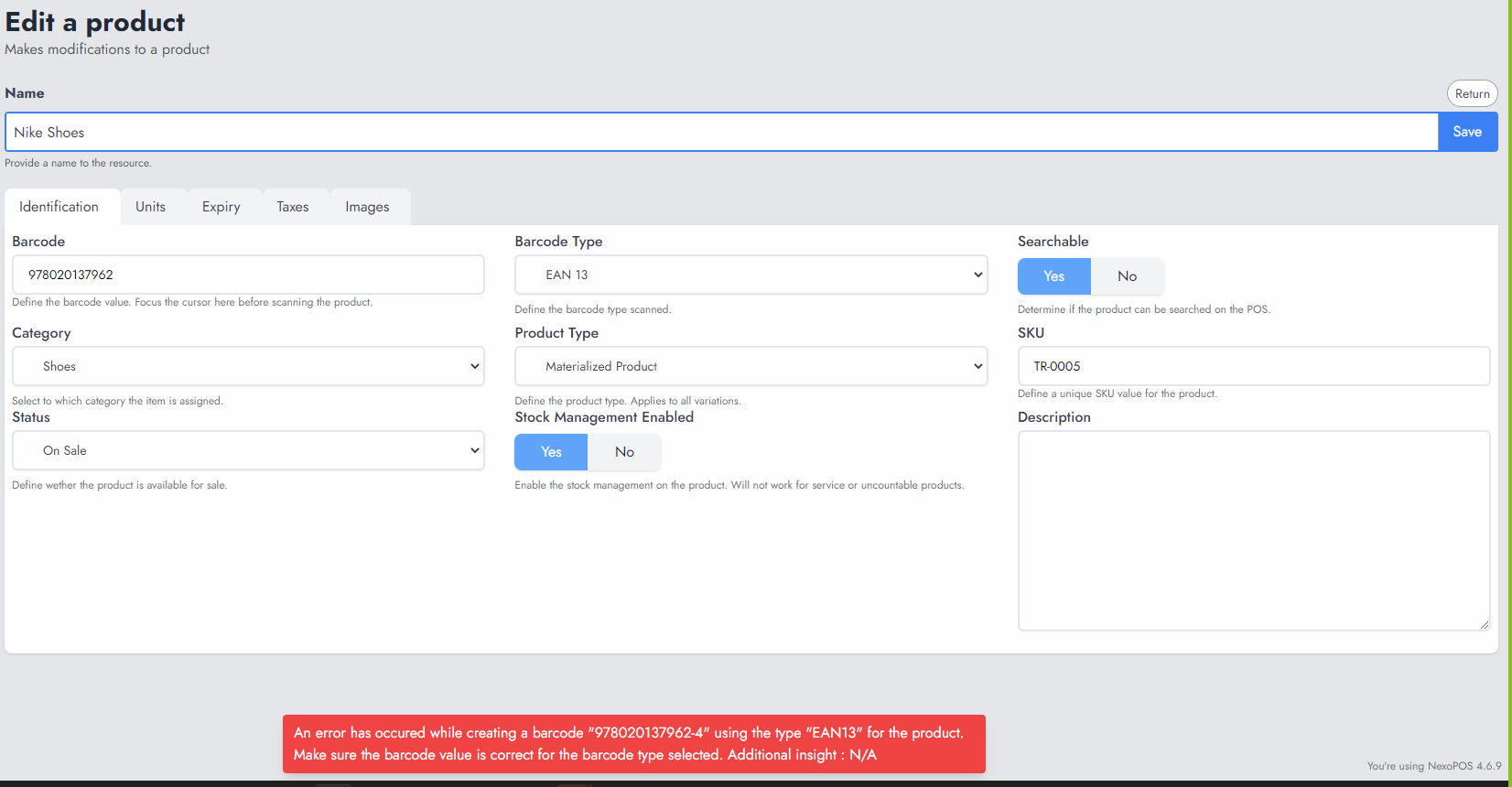 Hi, I am struggling to the EAN-13 or all the barcodes. i entered 13 numbers but once i tried to save it throws error on the below snapshot. tried several changes but still error couldn't pass please support |