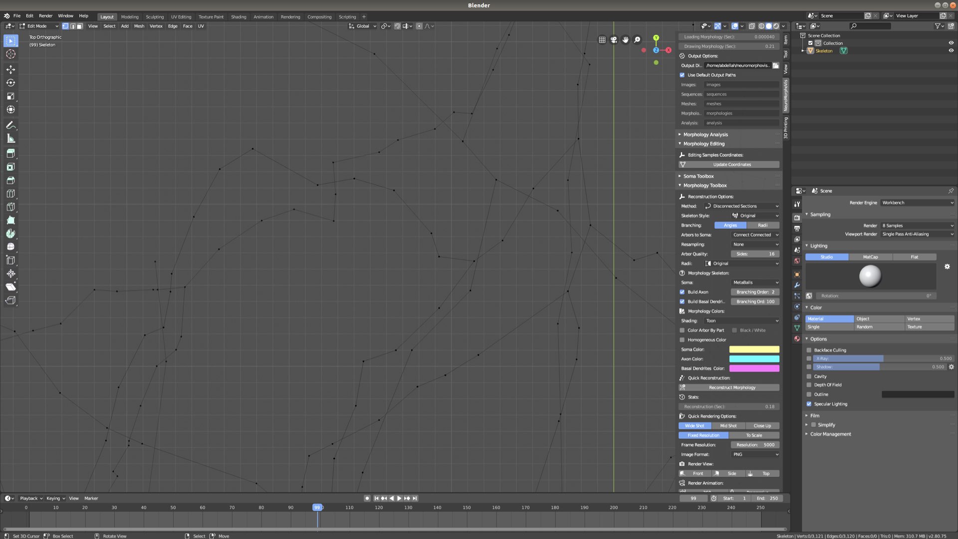 In certain cases, in particular, when a morphology file is downloaded from an open database, this morphology could be broken, i.e. self-intersecting branches or overlapping samples on any of its arbors. For such reasons, we have added a little utility that allows the user to sketch the morphology skeleton and edit the skeleton samples by moving the samples from one point to another. Then, the user can either export this modified morphology skeleton or to use it for other toolboxes in NeuroMorphoVis.