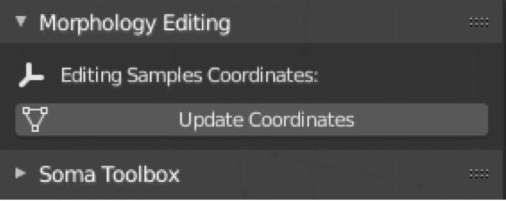 When you toggle (or click on) the Morphology Editing tab highlighted above, the following panel, or a similar one depending on the version of NeuroMorphoVis, will appear.